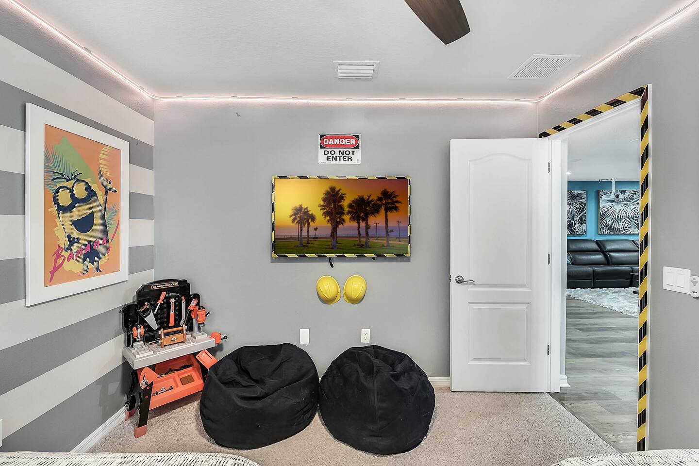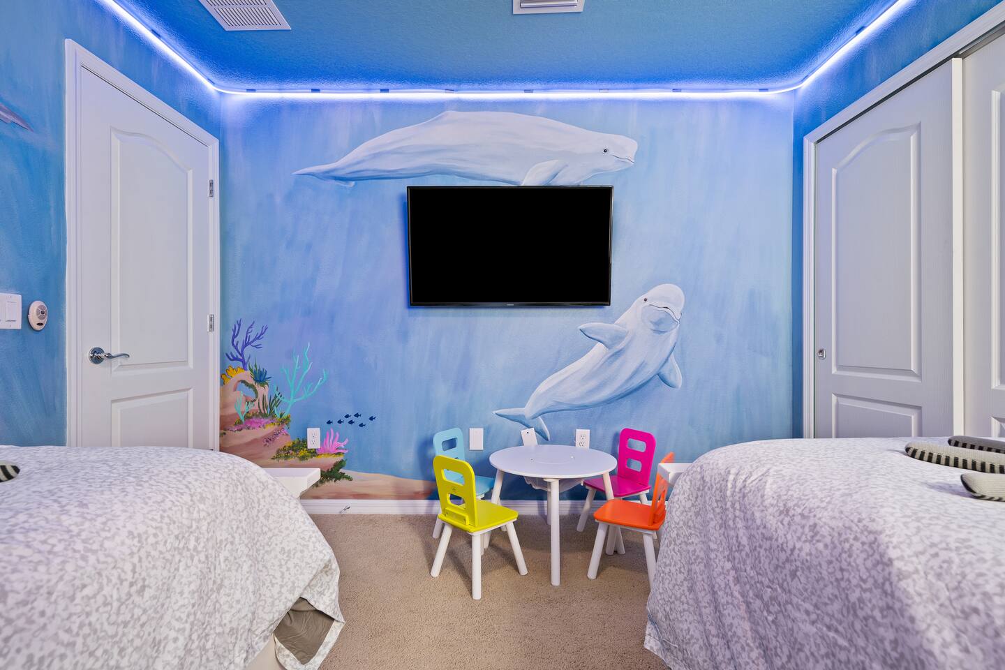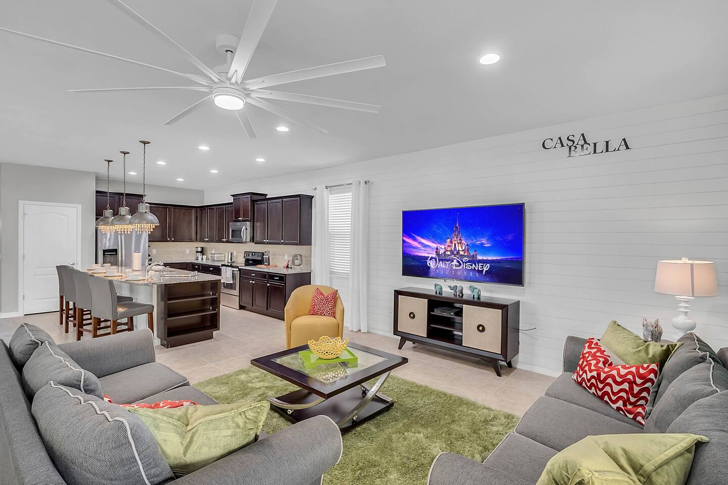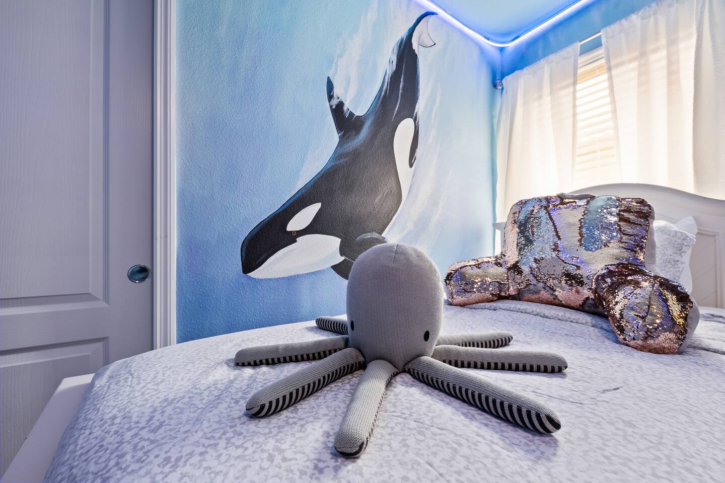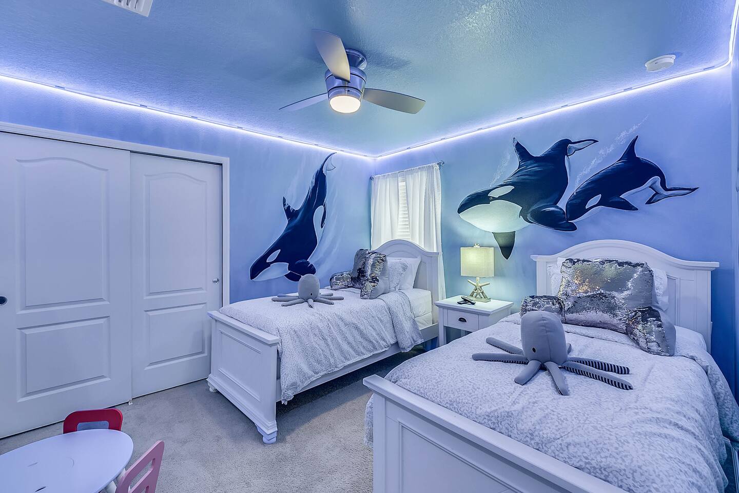 Professionally designed and furnished by one of the country’s foremost design experts, Casa Bella is one of Florida’s most unique vacation properties. The property has all that a family or large group needs for a completely immersive entertainment experience. With a private swimming pool, luxurious bedroom furnishings, themed kids rooms, game room, and a theater room, you can spend a whole day relaxing or having fun. With 4,000+ sq. ft. to share with your family or group coupled with the pool deck, this home holds up to 16+ guests. The home is also hypoallergenic with limited carpeting in the home and a ceiling fan in each bedroom to aide fresh airflow throughout the home. The home is a short walk from the state-of the art clubhouse at Windsor at Westside. What a great place for families to share! The game room is air-conditioned and fully stocked with action! Feeling competitive? Up for some games? Here you can find arcade games, foosball, Marvel Air Hockey, Ping-pong, an XBOX station with a large screen TV, and an additional large flat screen TV for watching your favorite movies or sports. The pool area is where you can enjoy the sun, the fresh air, and the refreshing pool water. There are sun loungers and a spillover spa for complete relaxation, sun loungers to top off your complete relaxation and a table where you can enjoy meals al fresco. For added safety, the pool deck comes equipped with a safety fence. The kitchen is fully equipped with all of your needs from stainless steel appliances, to a toaster and coffee maker. The home has a spacious open floor plan and sits on one of the best lots in Windsor at Westside. The dining area has seating for 16 where bellies are made full and memories are sure to be created. The breakfast bar also has 4 amazing bar stools to accommodate more family time together. By day watch your favorite shows on the wall-mounted 75" LED TV, then in the evenings enjoy movies and sports on the 120" projector screen complete with theater-like seating, complete state of the art surround sound system, and subwoofer. Upstairs there is a huge underwater immersive experience themed kids bedroom complete with hand-painted orcas, lifelike water effects, LED lighting, and other underwater amazement. There is also an amazing custom-built Minions themed bedroom complete with custom LED lighting.