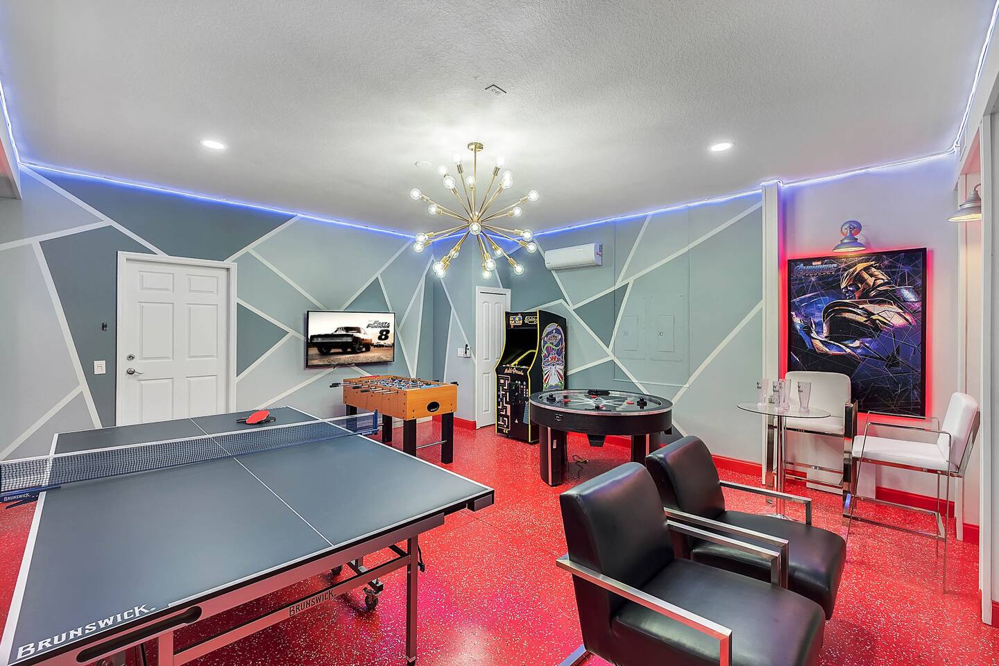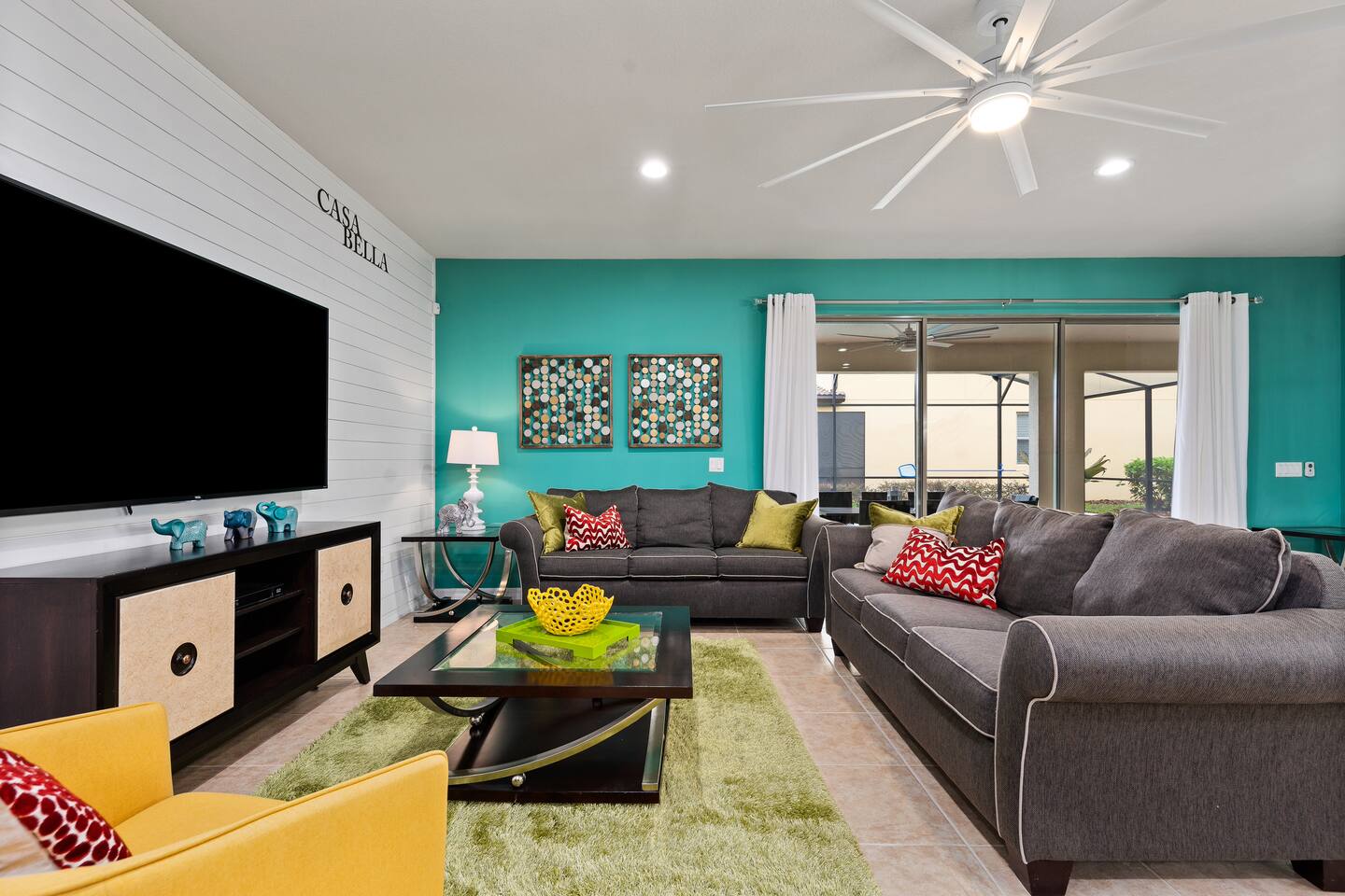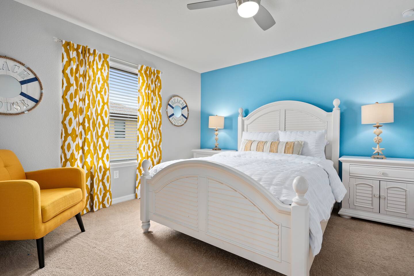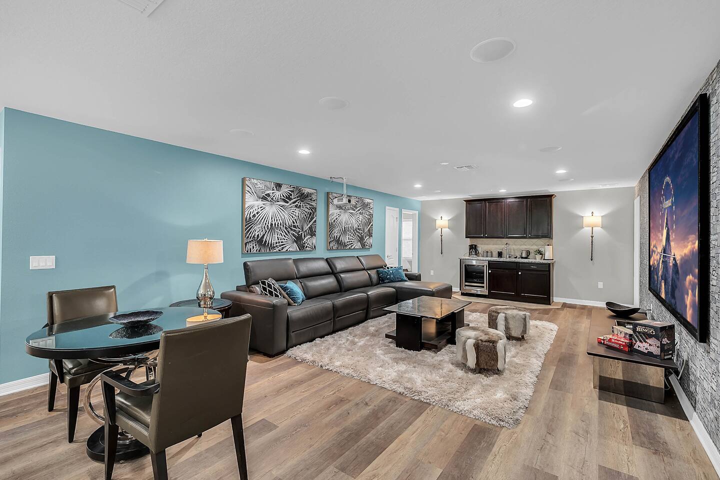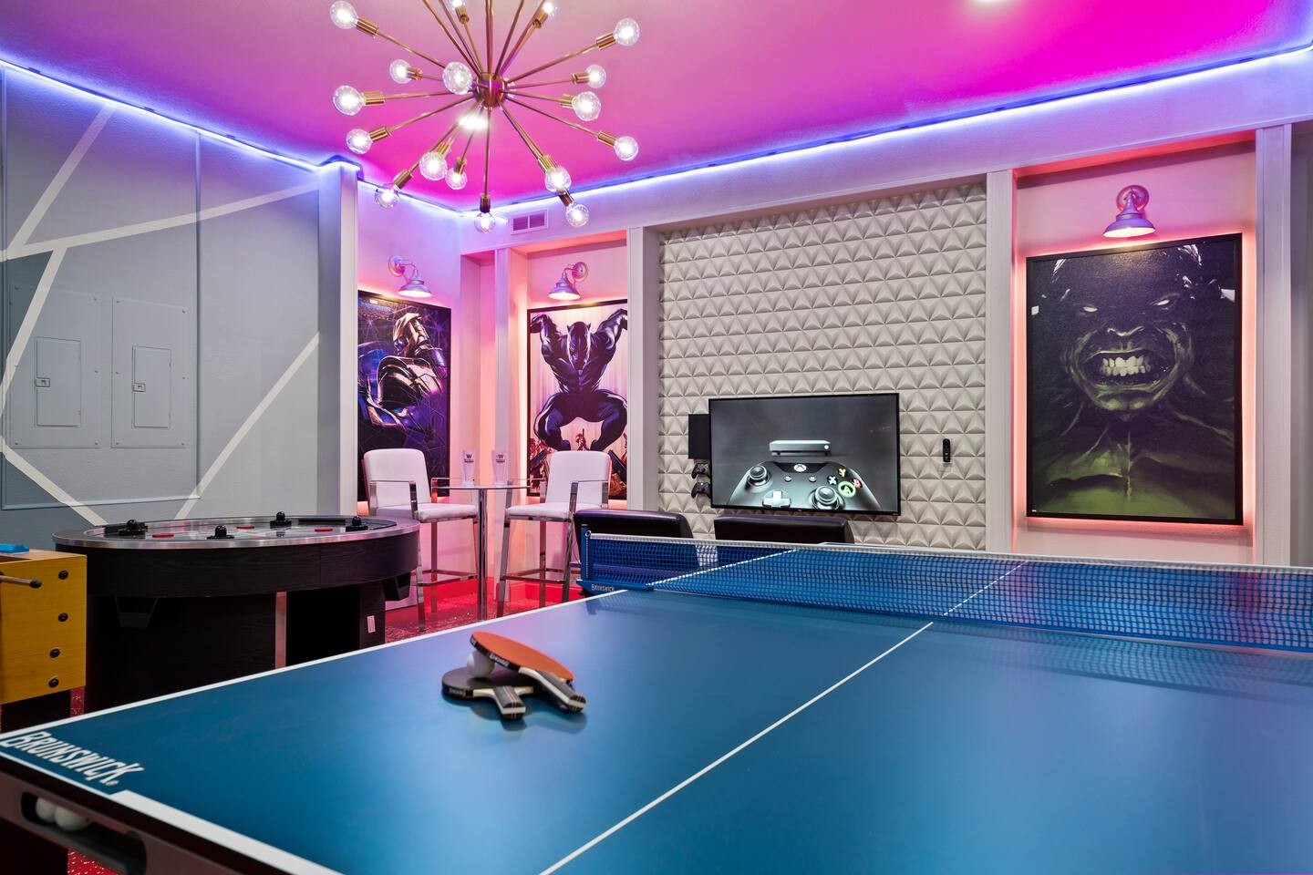 Professionally designed and furnished by one of the country’s foremost design experts, Casa Bella is one of Florida’s most unique vacation properties. The property has all that a family or large group needs for a completely immersive entertainment experience. With a private swimming pool, luxurious bedroom furnishings, themed kids rooms, game room, and a theater room, you can spend a whole day relaxing or having fun. With 4,000+ sq. ft. to share with your family or group coupled with the pool deck, this home holds up to 16+ guests. The home is also hypoallergenic with limited carpeting in the home and a ceiling fan in each bedroom to aide fresh airflow throughout the home. The home is a short walk from the state-of the art clubhouse at Windsor at Westside. What a great place for families to share! The game room is air-conditioned and fully stocked with action! Feeling competitive? Up for some games? Here you can find arcade games, foosball, Marvel Air Hockey, Ping-pong, an XBOX station with a large screen TV, and an additional large flat screen TV for watching your favorite movies or sports. The pool area is where you can enjoy the sun, the fresh air, and the refreshing pool water. There are sun loungers and a spillover spa for complete relaxation, sun loungers to top off your complete relaxation and a table where you can enjoy meals al fresco. For added safety, the pool deck comes equipped with a safety fence. The kitchen is fully equipped with all of your needs from stainless steel appliances, to a toaster and coffee maker. The home has a spacious open floor plan and sits on one of the best lots in Windsor at Westside. The dining area has seating for 16 where bellies are made full and memories are sure to be created. The breakfast bar also has 4 amazing bar stools to accommodate more family time together. By day watch your favorite shows on the wall-mounted 75" LED TV, then in the evenings enjoy movies and sports on the 120" projector screen complete with theater-like seating, complete state of the art surround sound system, and subwoofer. Upstairs there is a huge underwater immersive experience themed kids bedroom complete with hand-painted orcas, lifelike water effects, LED lighting, and other underwater amazement. There is also an amazing custom-built Minions themed bedroom complete with custom LED lighting.