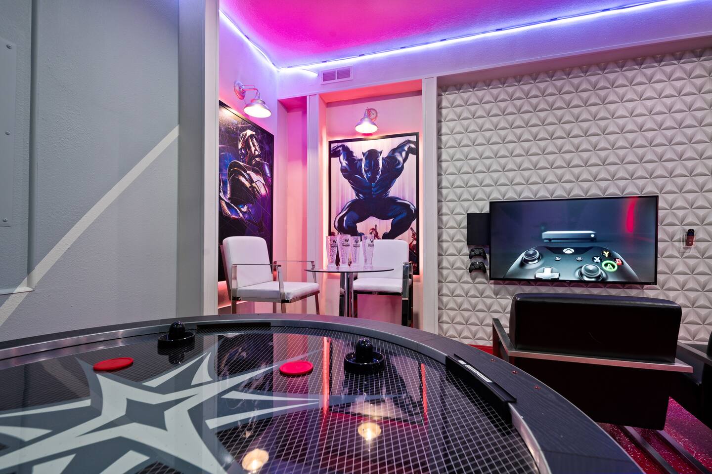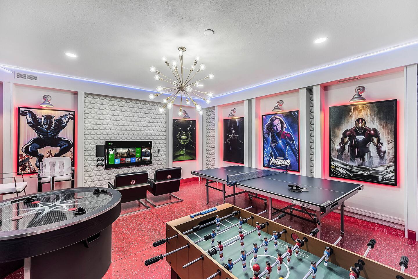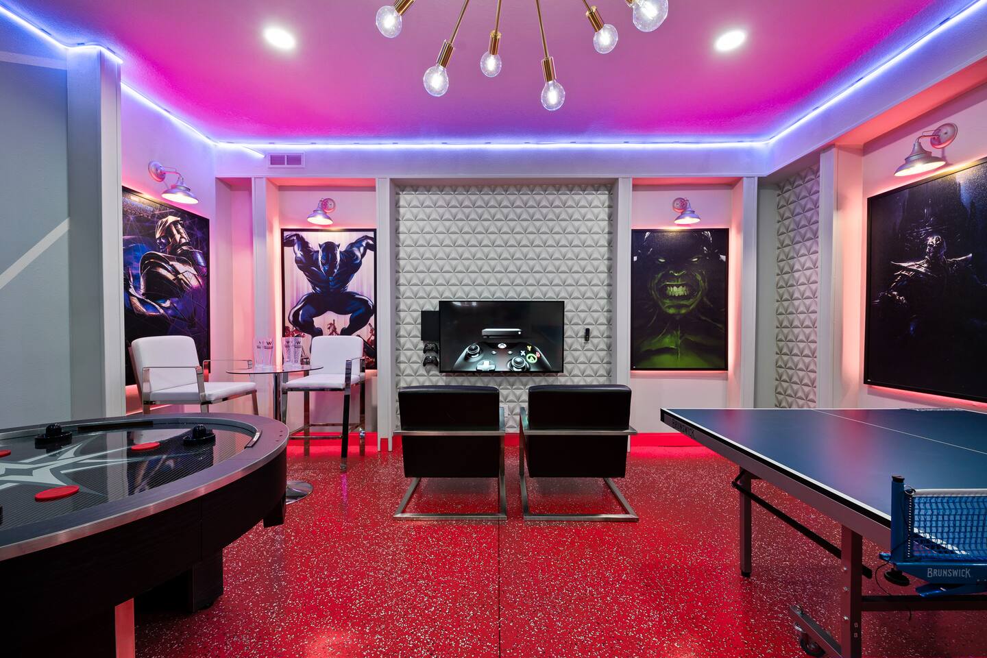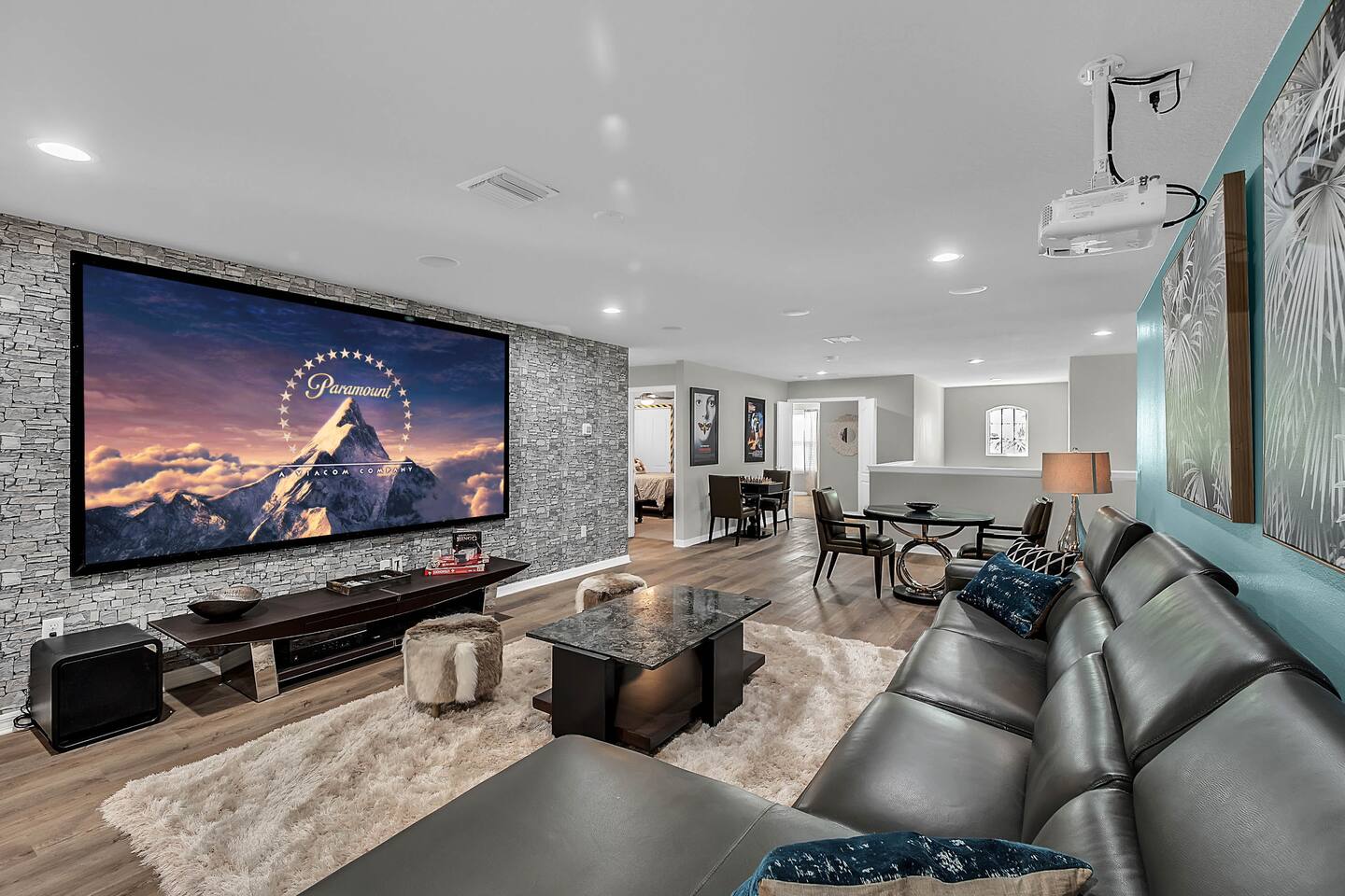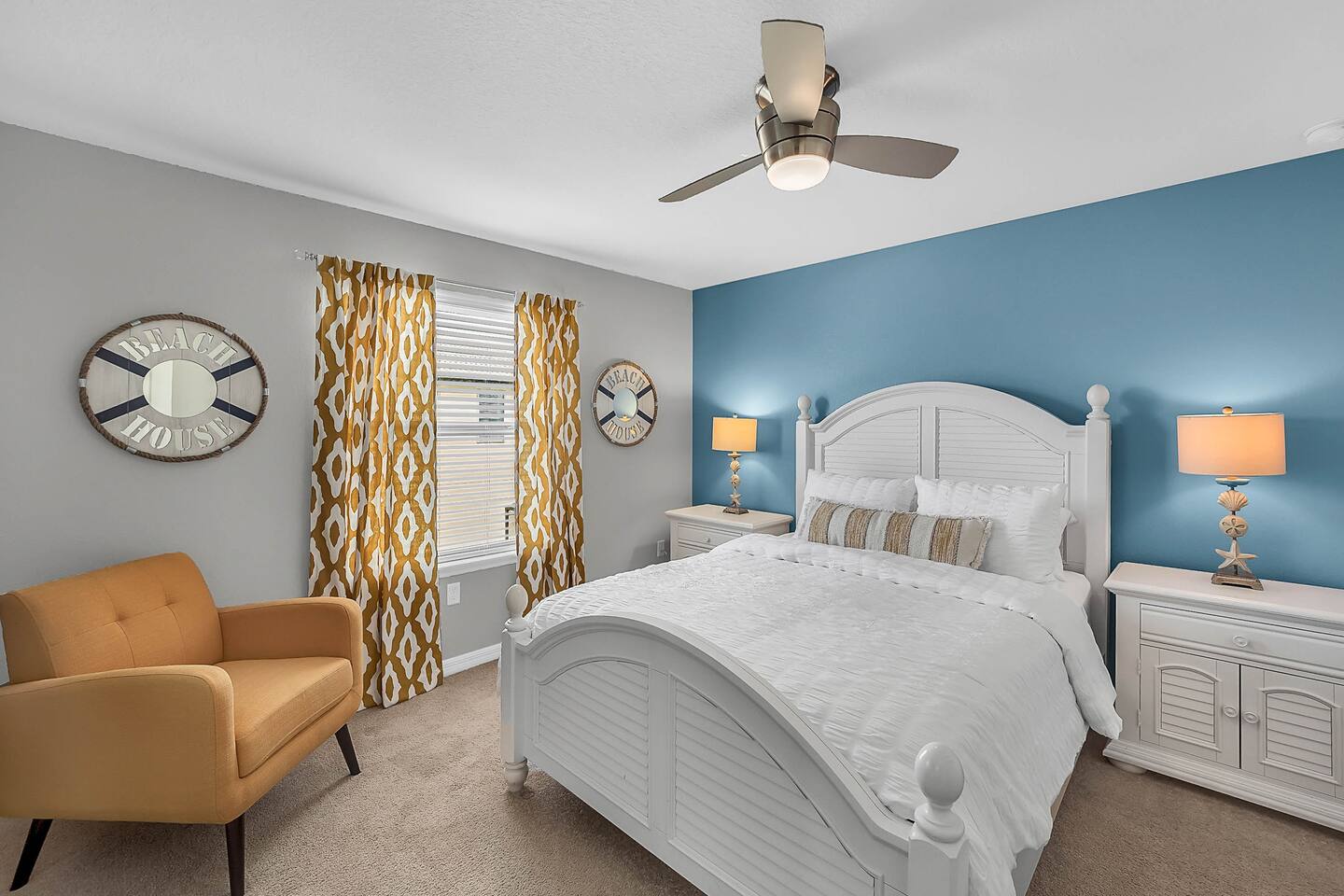 Professionally designed and furnished by one of the country’s foremost design experts, Casa Bella is one of Florida’s most unique vacation properties. The property has all that a family or large group needs for a completely immersive entertainment experience. With a private swimming pool, luxurious bedroom furnishings, themed kids rooms, game room, and a theater room, you can spend a whole day relaxing or having fun. With 4,000+ sq. ft. to share with your family or group coupled with the pool deck, this home holds up to 16+ guests. The home is also hypoallergenic with limited carpeting in the home and a ceiling fan in each bedroom to aide fresh airflow throughout the home. The home is a short walk from the state-of the art clubhouse at Windsor at Westside. What a great place for families to share! The game room is air-conditioned and fully stocked with action! Feeling competitive? Up for some games? Here you can find arcade games, foosball, Marvel Air Hockey, Ping-pong, an XBOX station with a large screen TV, and an additional large flat screen TV for watching your favorite movies or sports. The pool area is where you can enjoy the sun, the fresh air, and the refreshing pool water. There are sun loungers and a spillover spa for complete relaxation, sun loungers to top off your complete relaxation and a table where you can enjoy meals al fresco. For added safety, the pool deck comes equipped with a safety fence. The kitchen is fully equipped with all of your needs from stainless steel appliances, to a toaster and coffee maker. The home has a spacious open floor plan and sits on one of the best lots in Windsor at Westside. The dining area has seating for 16 where bellies are made full and memories are sure to be created. The breakfast bar also has 4 amazing bar stools to accommodate more family time together. By day watch your favorite shows on the wall-mounted 75" LED TV, then in the evenings enjoy movies and sports on the 120" projector screen complete with theater-like seating, complete state of the art surround sound system, and subwoofer. Upstairs there is a huge underwater immersive experience themed kids bedroom complete with hand-painted orcas, lifelike water effects, LED lighting, and other underwater amazement. There is also an amazing custom-built Minions themed bedroom complete with custom LED lighting.