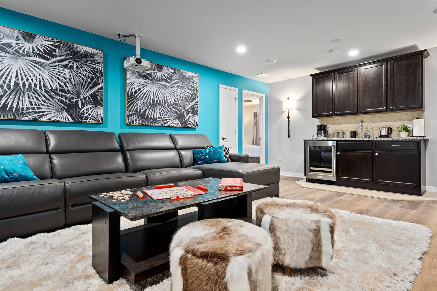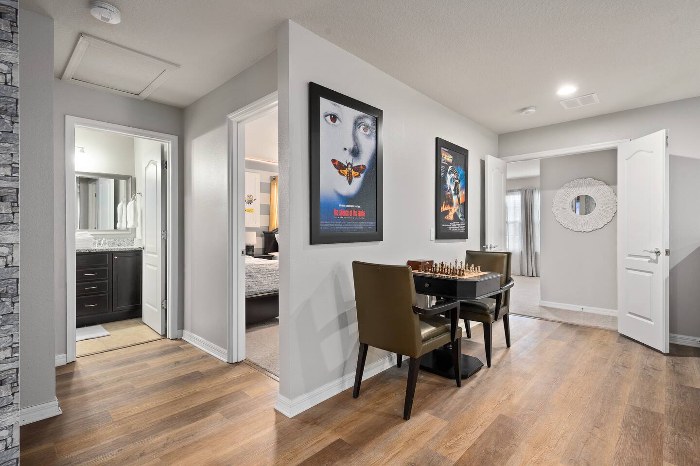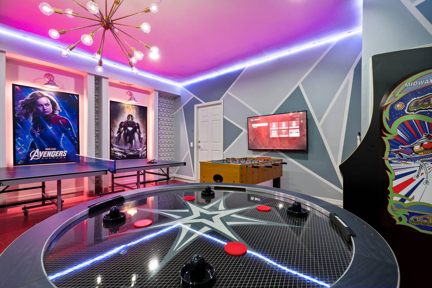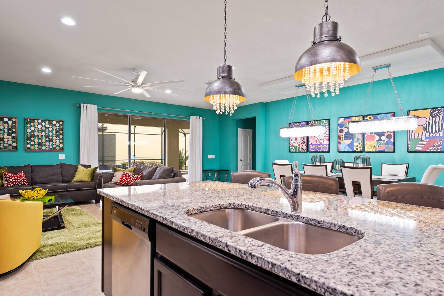 Professionally designed and furnished by one of the country’s foremost design experts, Casa Bella is one of Florida’s most unique vacation properties. The property has all that a family or large group needs for a completely immersive entertainment experience. With a private swimming pool, luxurious bedroom furnishings, themed kids rooms, game room, and a theater room, you can spend a whole day relaxing or having fun. With 4,000+ sq. ft. to share with your family or group coupled with the pool deck, this home holds up to 16+ guests. The home is also hypoallergenic with limited carpeting in the home and a ceiling fan in each bedroom to aide fresh airflow throughout the home. The home is a short walk from the state-of the art clubhouse at Windsor at Westside. What a great place for families to share! The game room is air-conditioned and fully stocked with action! Feeling competitive? Up for some games? Here you can find arcade games, foosball, Marvel Air Hockey, Ping-pong, an XBOX station with a large screen TV, and an additional large flat screen TV for watching your favorite movies or sports. The pool area is where you can enjoy the sun, the fresh air, and the refreshing pool water. There are sun loungers and a spillover spa for complete relaxation, sun loungers to top off your complete relaxation and a table where you can enjoy meals al fresco. For added safety, the pool deck comes equipped with a safety fence. The kitchen is fully equipped with all of your needs from stainless steel appliances, to a toaster and coffee maker. The home has a spacious open floor plan and sits on one of the best lots in Windsor at Westside. The dining area has seating for 16 where bellies are made full and memories are sure to be created. The breakfast bar also has 4 amazing bar stools to accommodate more family time together. By day watch your favorite shows on the wall-mounted 75" LED TV, then in the evenings enjoy movies and sports on the 120" projector screen complete with theater-like seating, complete state of the art surround sound system, and subwoofer. Upstairs there is a huge underwater immersive experience themed kids bedroom complete with hand-painted orcas, lifelike water effects, LED lighting, and other underwater amazement. There is also an amazing custom-built Minions themed bedroom complete with custom LED lighting.