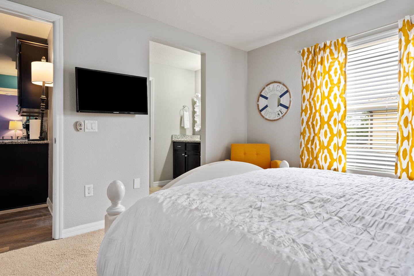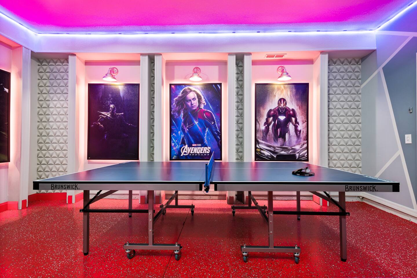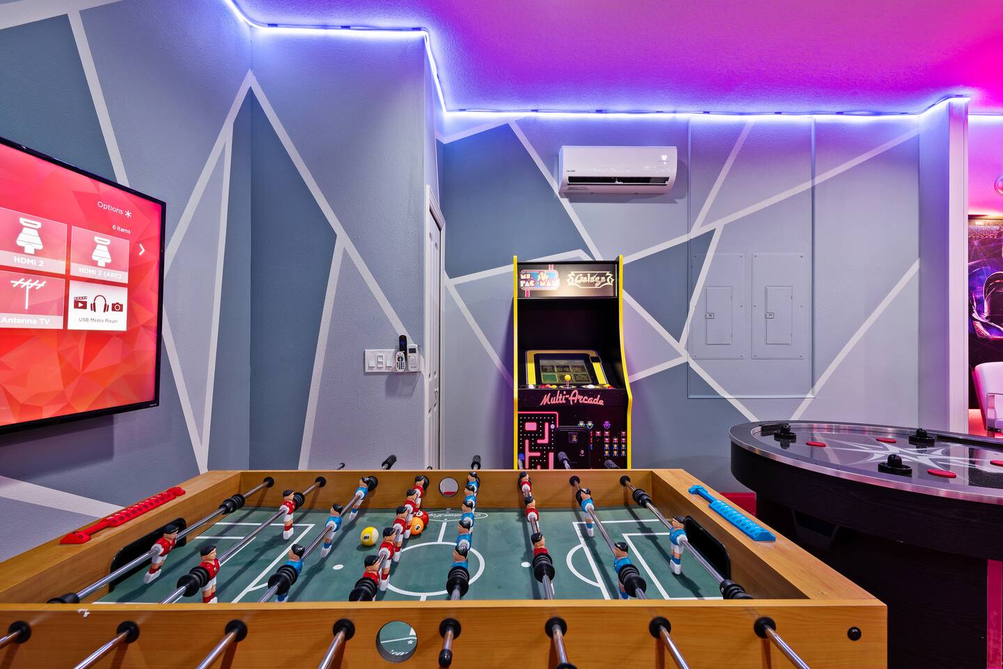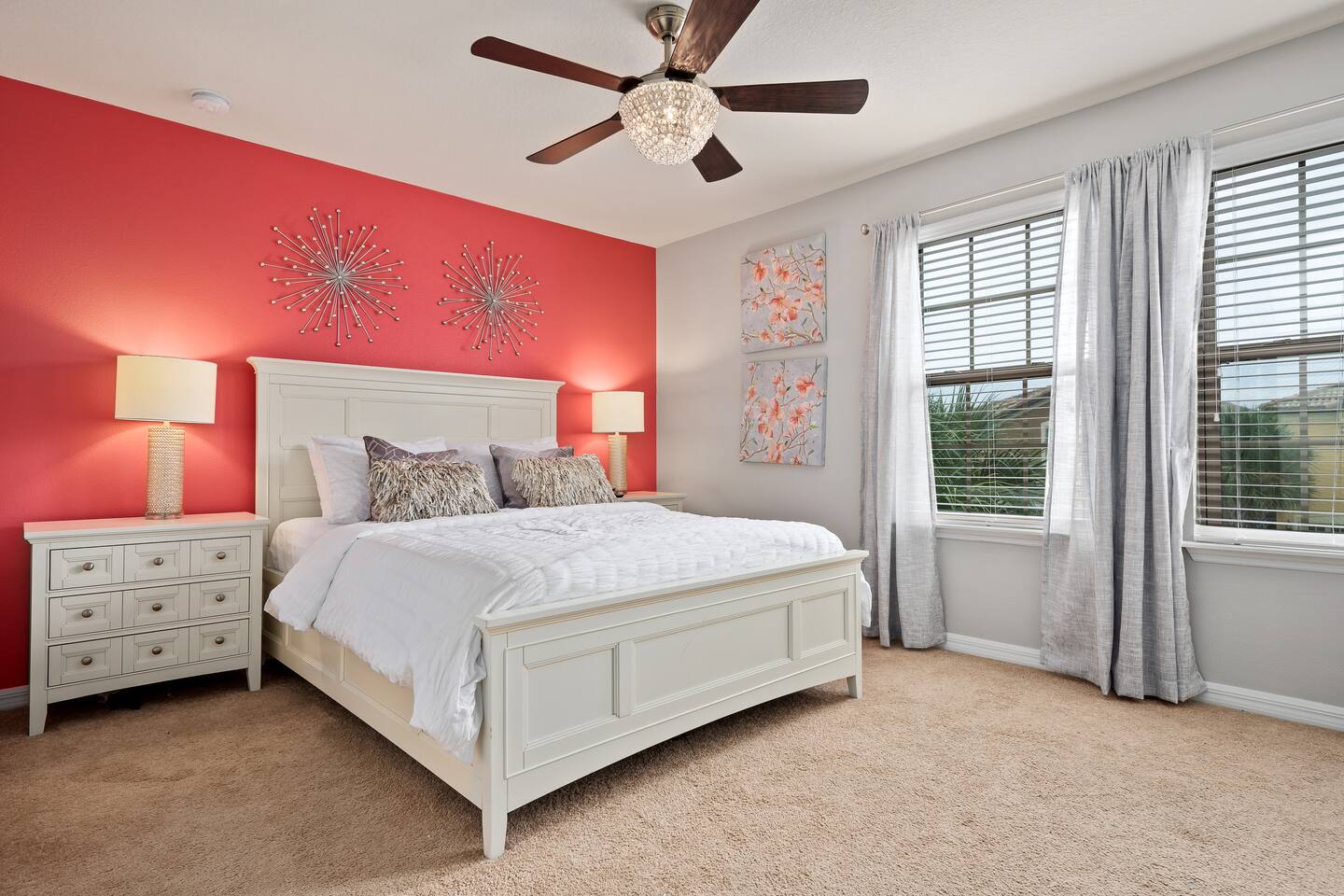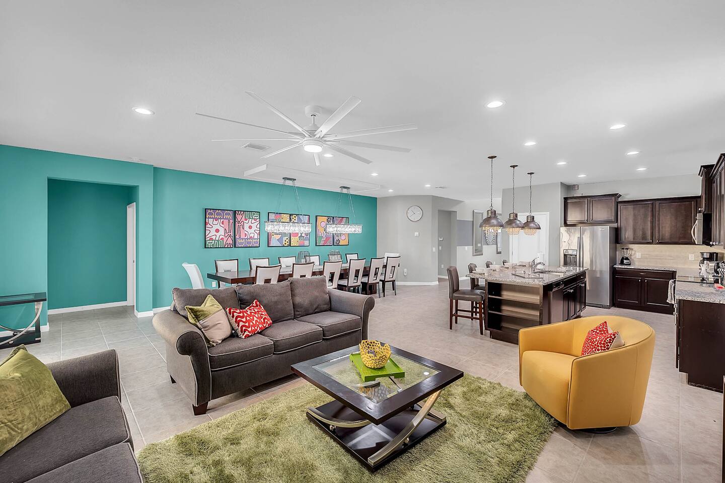 Professionally designed and furnished by one of the country’s foremost design experts, Casa Bella is one of Florida’s most unique vacation properties. The property has all that a family or large group needs for a completely immersive entertainment experience. With a private swimming pool, luxurious bedroom furnishings, themed kids rooms, game room, and a theater room, you can spend a whole day relaxing or having fun. With 4,000+ sq. ft. to share with your family or group coupled with the pool deck, this home holds up to 16+ guests. The home is also hypoallergenic with limited carpeting in the home and a ceiling fan in each bedroom to aide fresh airflow throughout the home. The home is a short walk from the state-of the art clubhouse at Windsor at Westside. What a great place for families to share! The game room is air-conditioned and fully stocked with action! Feeling competitive? Up for some games? Here you can find arcade games, foosball, Marvel Air Hockey, Ping-pong, an XBOX station with a large screen TV, and an additional large flat screen TV for watching your favorite movies or sports. The pool area is where you can enjoy the sun, the fresh air, and the refreshing pool water. There are sun loungers and a spillover spa for complete relaxation, sun loungers to top off your complete relaxation and a table where you can enjoy meals al fresco. For added safety, the pool deck comes equipped with a safety fence. The kitchen is fully equipped with all of your needs from stainless steel appliances, to a toaster and coffee maker. The home has a spacious open floor plan and sits on one of the best lots in Windsor at Westside. The dining area has seating for 16 where bellies are made full and memories are sure to be created. The breakfast bar also has 4 amazing bar stools to accommodate more family time together. By day watch your favorite shows on the wall-mounted 75" LED TV, then in the evenings enjoy movies and sports on the 120" projector screen complete with theater-like seating, complete state of the art surround sound system, and subwoofer. Upstairs there is a huge underwater immersive experience themed kids bedroom complete with hand-painted orcas, lifelike water effects, LED lighting, and other underwater amazement. There is also an amazing custom-built Minions themed bedroom complete with custom LED lighting.
