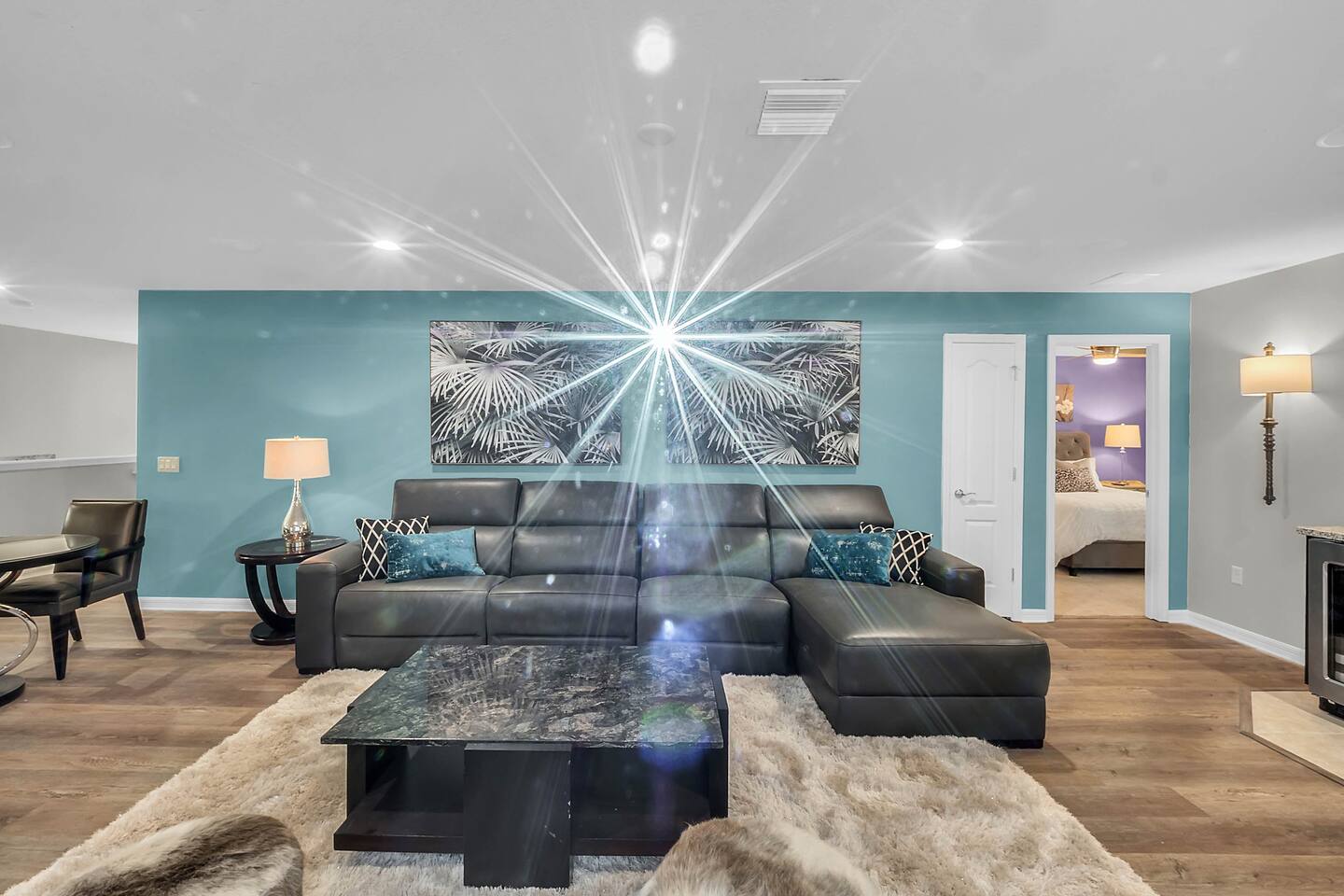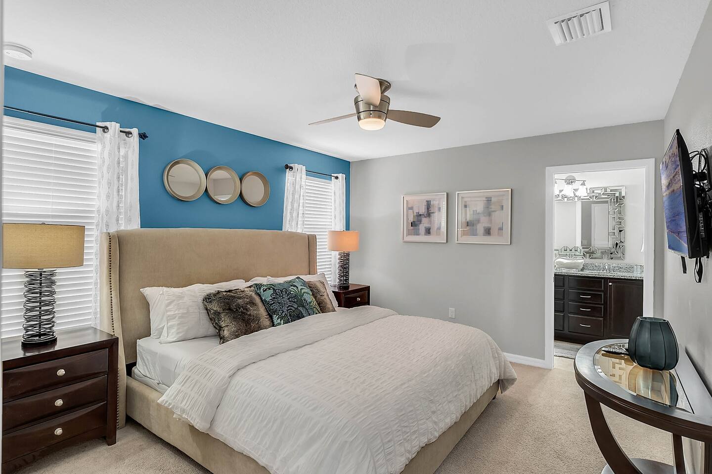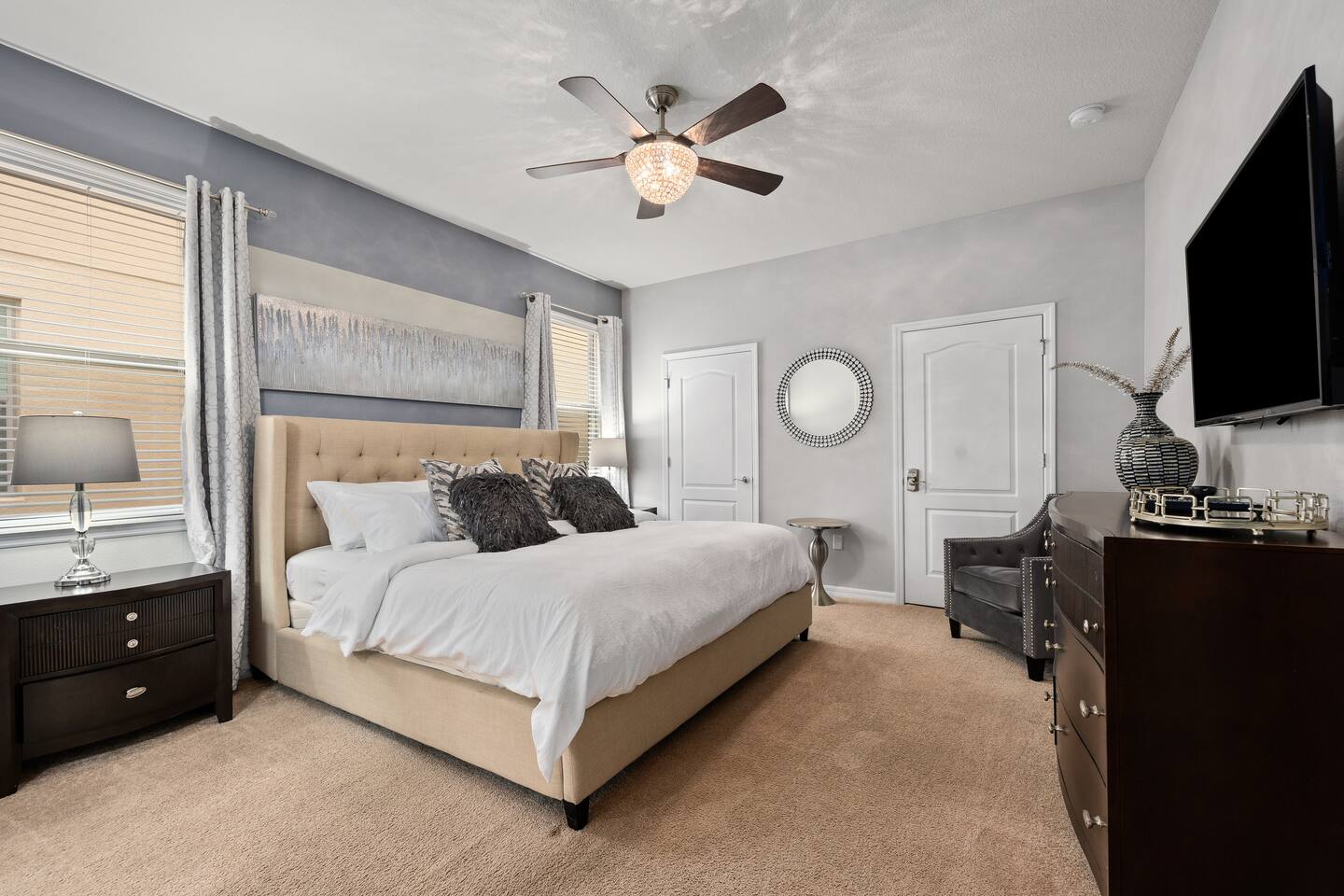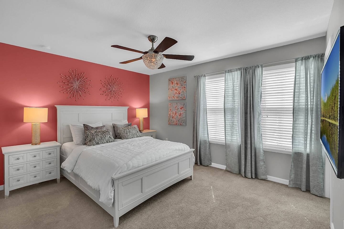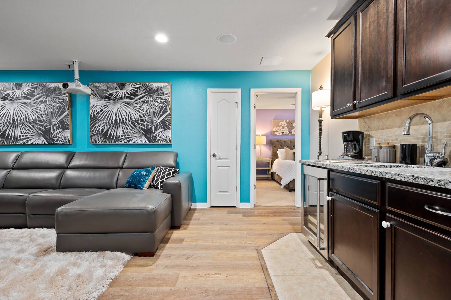 Professionally designed and furnished by one of the country’s foremost design experts, Casa Bella is one of Florida’s most unique vacation properties. The property has all that a family or large group needs for a completely immersive entertainment experience. With a private swimming pool, luxurious bedroom furnishings, themed kids rooms, game room, and a theater room, you can spend a whole day relaxing or having fun. With 4,000+ sq. ft. to share with your family or group coupled with the pool deck, this home holds up to 16+ guests. The home is also hypoallergenic with limited carpeting in the home and a ceiling fan in each bedroom to aide fresh airflow throughout the home. The home is a short walk from the state-of the art clubhouse at Windsor at Westside. What a great place for families to share! The game room is air-conditioned and fully stocked with action! Feeling competitive? Up for some games? Here you can find arcade games, foosball, Marvel Air Hockey, Ping-pong, an XBOX station with a large screen TV, and an additional large flat screen TV for watching your favorite movies or sports. The pool area is where you can enjoy the sun, the fresh air, and the refreshing pool water. There are sun loungers and a spillover spa for complete relaxation, sun loungers to top off your complete relaxation and a table where you can enjoy meals al fresco. For added safety, the pool deck comes equipped with a safety fence. The kitchen is fully equipped with all of your needs from stainless steel appliances, to a toaster and coffee maker. The home has a spacious open floor plan and sits on one of the best lots in Windsor at Westside. The dining area has seating for 16 where bellies are made full and memories are sure to be created. The breakfast bar also has 4 amazing bar stools to accommodate more family time together. By day watch your favorite shows on the wall-mounted 75" LED TV, then in the evenings enjoy movies and sports on the 120" projector screen complete with theater-like seating, complete state of the art surround sound system, and subwoofer. Upstairs there is a huge underwater immersive experience themed kids bedroom complete with hand-painted orcas, lifelike water effects, LED lighting, and other underwater amazement. There is also an amazing custom-built Minions themed bedroom complete with custom LED lighting.