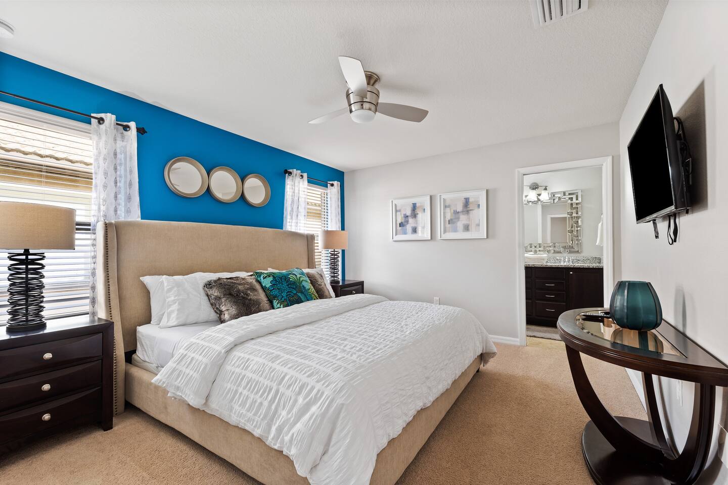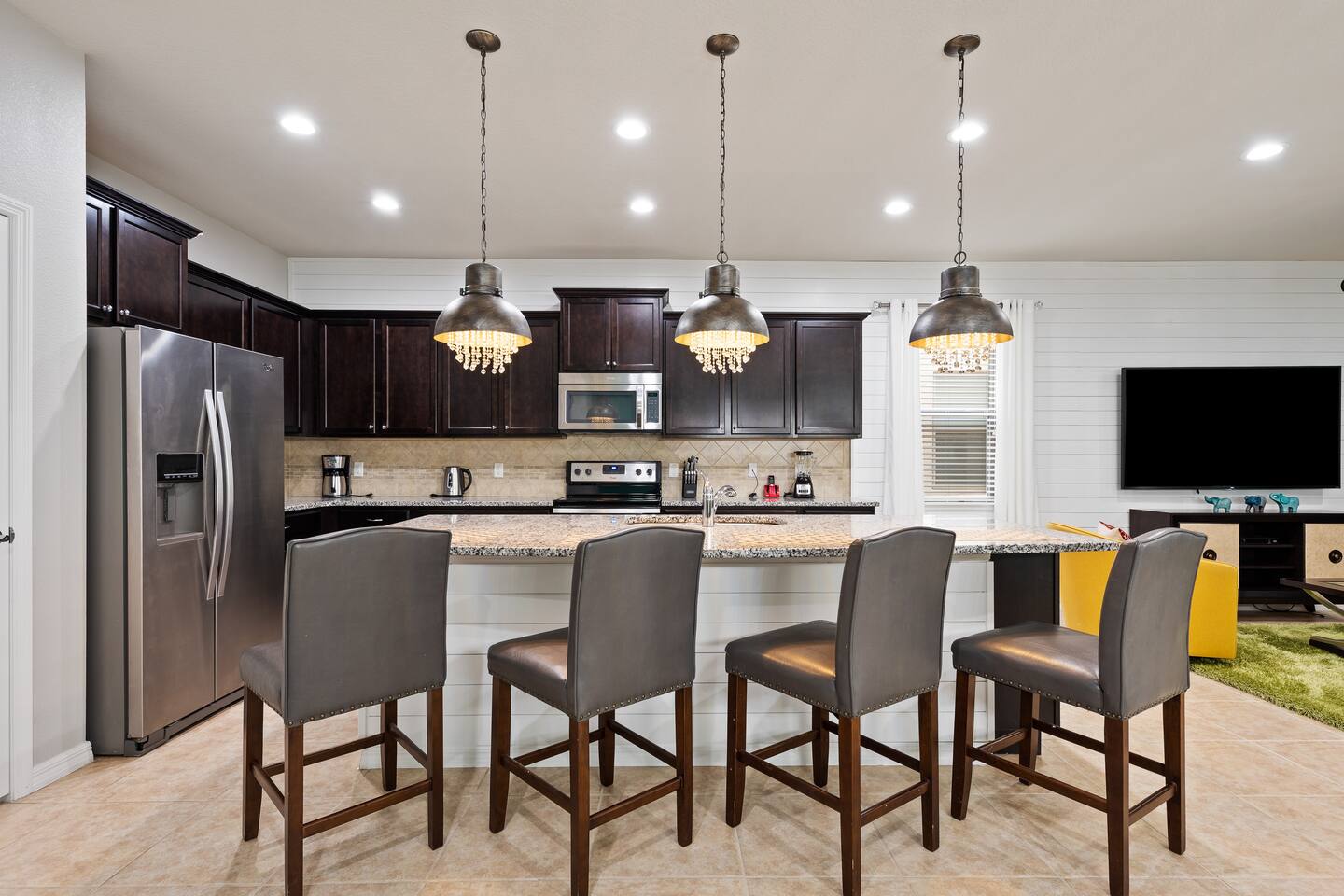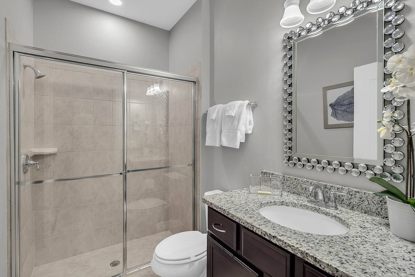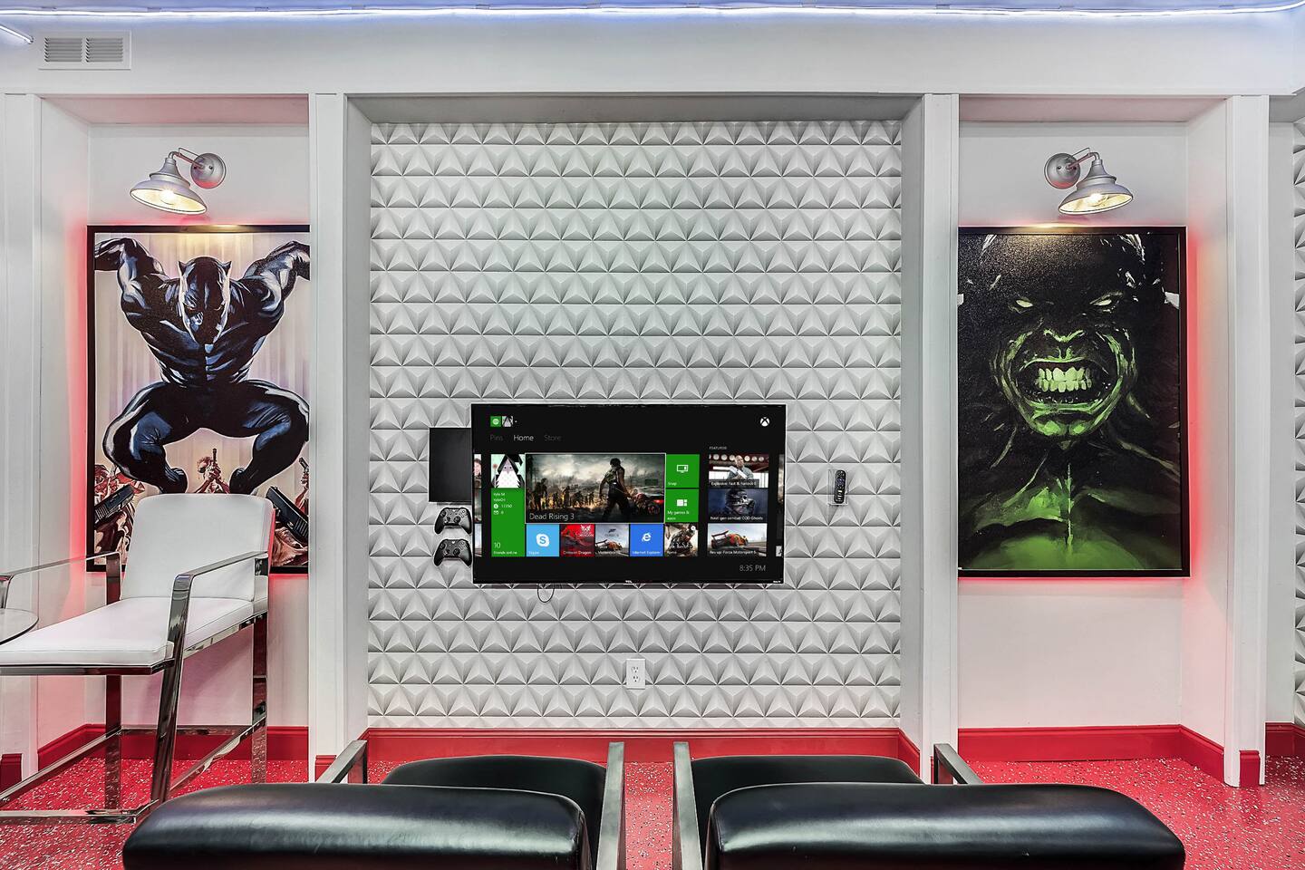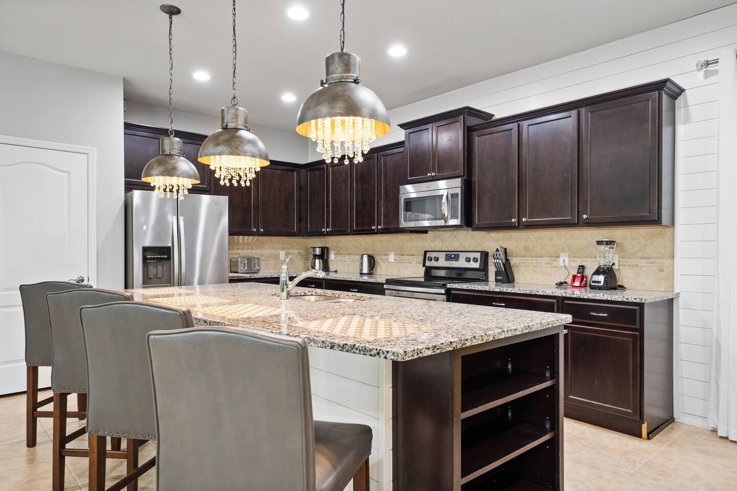 Professionally designed and furnished by one of the country’s foremost design experts, Casa Bella is one of Florida’s most unique vacation properties. The property has all that a family or large group needs for a completely immersive entertainment experience. With a private swimming pool, luxurious bedroom furnishings, themed kids rooms, game room, and a theater room, you can spend a whole day relaxing or having fun. With 4,000+ sq. ft. to share with your family or group coupled with the pool deck, this home holds up to 16+ guests. The home is also hypoallergenic with limited carpeting in the home and a ceiling fan in each bedroom to aide fresh airflow throughout the home. The home is a short walk from the state-of the art clubhouse at Windsor at Westside. What a great place for families to share! The game room is air-conditioned and fully stocked with action! Feeling competitive? Up for some games? Here you can find arcade games, foosball, Marvel Air Hockey, Ping-pong, an XBOX station with a large screen TV, and an additional large flat screen TV for watching your favorite movies or sports. The pool area is where you can enjoy the sun, the fresh air, and the refreshing pool water. There are sun loungers and a spillover spa for complete relaxation, sun loungers to top off your complete relaxation and a table where you can enjoy meals al fresco. For added safety, the pool deck comes equipped with a safety fence. The kitchen is fully equipped with all of your needs from stainless steel appliances, to a toaster and coffee maker. The home has a spacious open floor plan and sits on one of the best lots in Windsor at Westside. The dining area has seating for 16 where bellies are made full and memories are sure to be created. The breakfast bar also has 4 amazing bar stools to accommodate more family time together. By day watch your favorite shows on the wall-mounted 75" LED TV, then in the evenings enjoy movies and sports on the 120" projector screen complete with theater-like seating, complete state of the art surround sound system, and subwoofer. Upstairs there is a huge underwater immersive experience themed kids bedroom complete with hand-painted orcas, lifelike water effects, LED lighting, and other underwater amazement. There is also an amazing custom-built Minions themed bedroom complete with custom LED lighting.