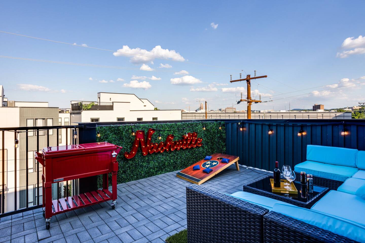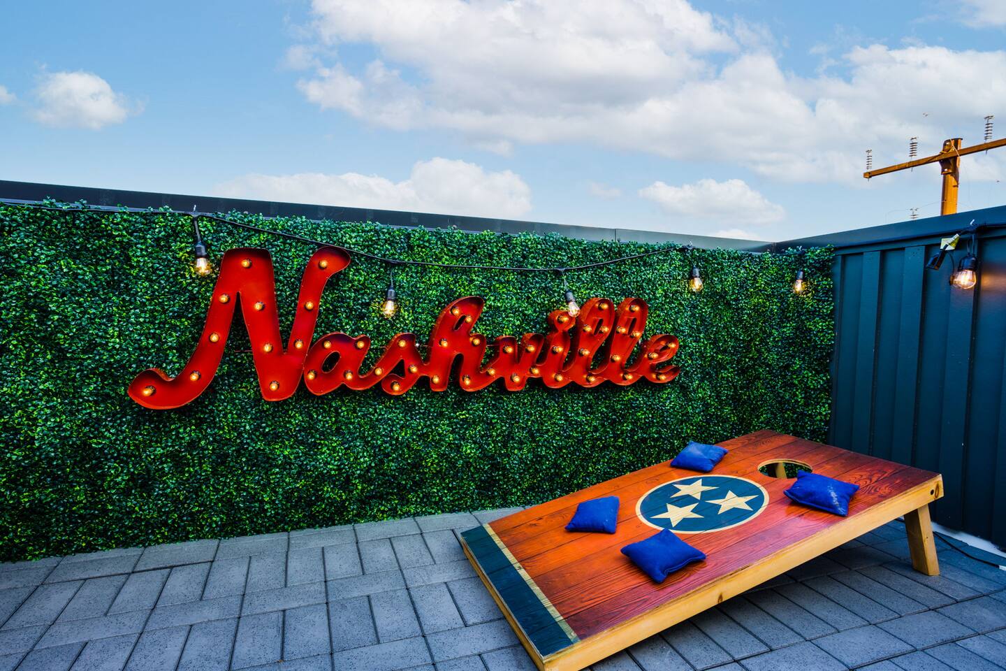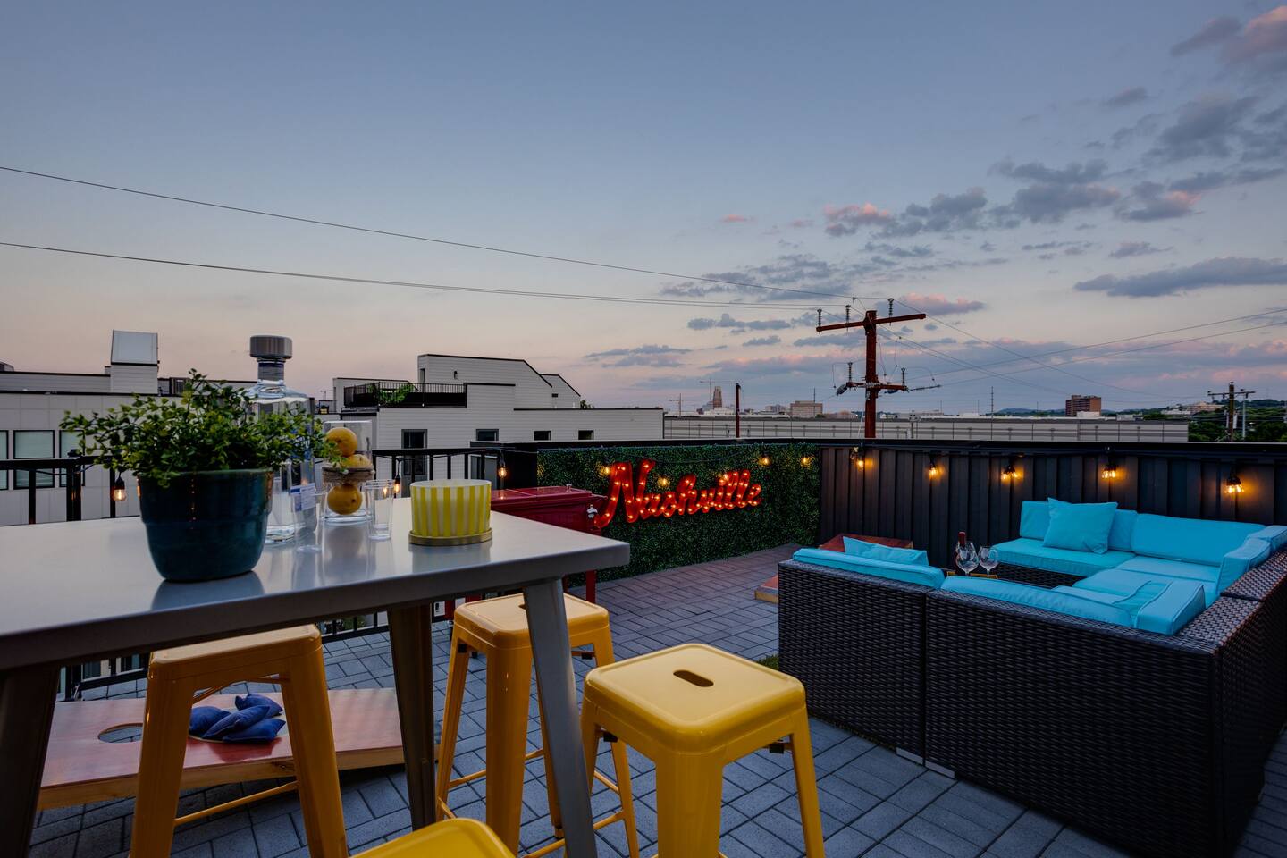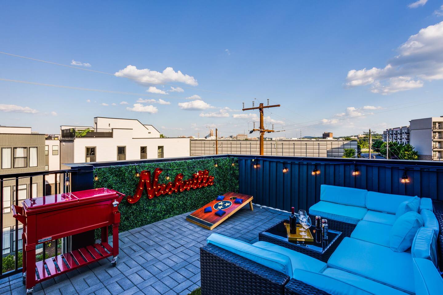 The space Layout: The first floor is comprised of a bedroom with a full bathroom attached. The bed arrangement has 2 twin beds and 2 pullout twin beds below. The second floor is comprised of the second bedroom, with 2 queen size beds, and a full bathroom attached. The third floor has a bedroom bunk set-up with two full size beds and a full bathroom is located in the hall to the left. The master bedroom complete with a king bed is down the hall with a full bathroom attached, featuring a shower with luxury rain fall head. MANAGED AND DESIGNED BY @EXTREMLYSUITE ☆☆☆ LISTING MUST KNOWS ☆☆☆ ★ 2 miles to Downtown Nashville ★ Towels and Linens provided ★ Washer/Dryer ★ Keurig Coffee machine ★ Fully stocked modern kitchen ★ State of the Art Appliances ★ 4 Bedrooms 4 Bathrooms ★ 9 Beds ★ Large Open Concept Living Area ★ Large Rooftop deck with amazing views ★ Indoor Dining ★ Outdoor Lounge space ★ SMART 4k TVs with streaming capability in every bedroom and living room + cable ★ Smart Lock Keyless Entry ★Garage Parking available and free street parking ★Dedicated workspaces throughout the house ★Blazing fast internet ★Garage Game Room with Karaoke/Corn hole Traveling doesn't mean having to eat out for every meal. We supply all of the kitchen necessities so you are able to cook or reheat leftovers easily! We have everything from pots and pans, and a Keurig coffee maker. ☆☆ 9 BEDS ☆☆ ★ Bedroom 1 ....... 4 Single Beds ★ Bedroom 2 ....... 2 Queen Beds ★ Bedroom 3 ....... 2 Double Beds ★ Bedroom 4 ....... 1 King Bed INTERIOR DETAILS Be sure to check out the detailed property photos for more details about the room layout and bed configuration. _ KITCHEN & DINING The home features a gorgeous kitchen and a wide-open living room. For those who love to cook, this is a fully stocked chef's paradise. _ BATHROOMS Most of the bathrooms have single or double vanities and glass showers. Two of the bathrooms have soaking tubs should you be so inclined to take a bubble bath during your stay. We stock the bathrooms with plenty of bath and hand towels, washcloths, cosmetic towels, and floor mats to give you something nice and fluffy to step on when getting out of the shower. You'll also find hairdryers in each bathroom along with plenty of spa-quality shampoos, conditioners, and body wash. _ BEDROOMS Enjoy the cool comfort and support of our Gel-infused Green Tea Memory Foam mattresses and super soft, 480 thread count cotton sateen sheets, woven with a rich, lustrous finish. Each bedroom is equipped with a Roku TV which gives you access to thousands of streaming channels such as Netflix, YouTube TV, Hulu, and Amazon Prime. _ BOARD GAMES You'll find board and card games scattered throughout the home like Uno, Catan, Cards Against Humanity, and more. _ ROOFTOP TERRACE On our rooftop, take in the skyline views of Downtown Nashville, enjoy some chilled drinks in the cooler, test your skills at cornhole, and enjoy the luxurious outdoor furniture. ***No Parties or Events Allowed*** Use bunk beds at your own risk