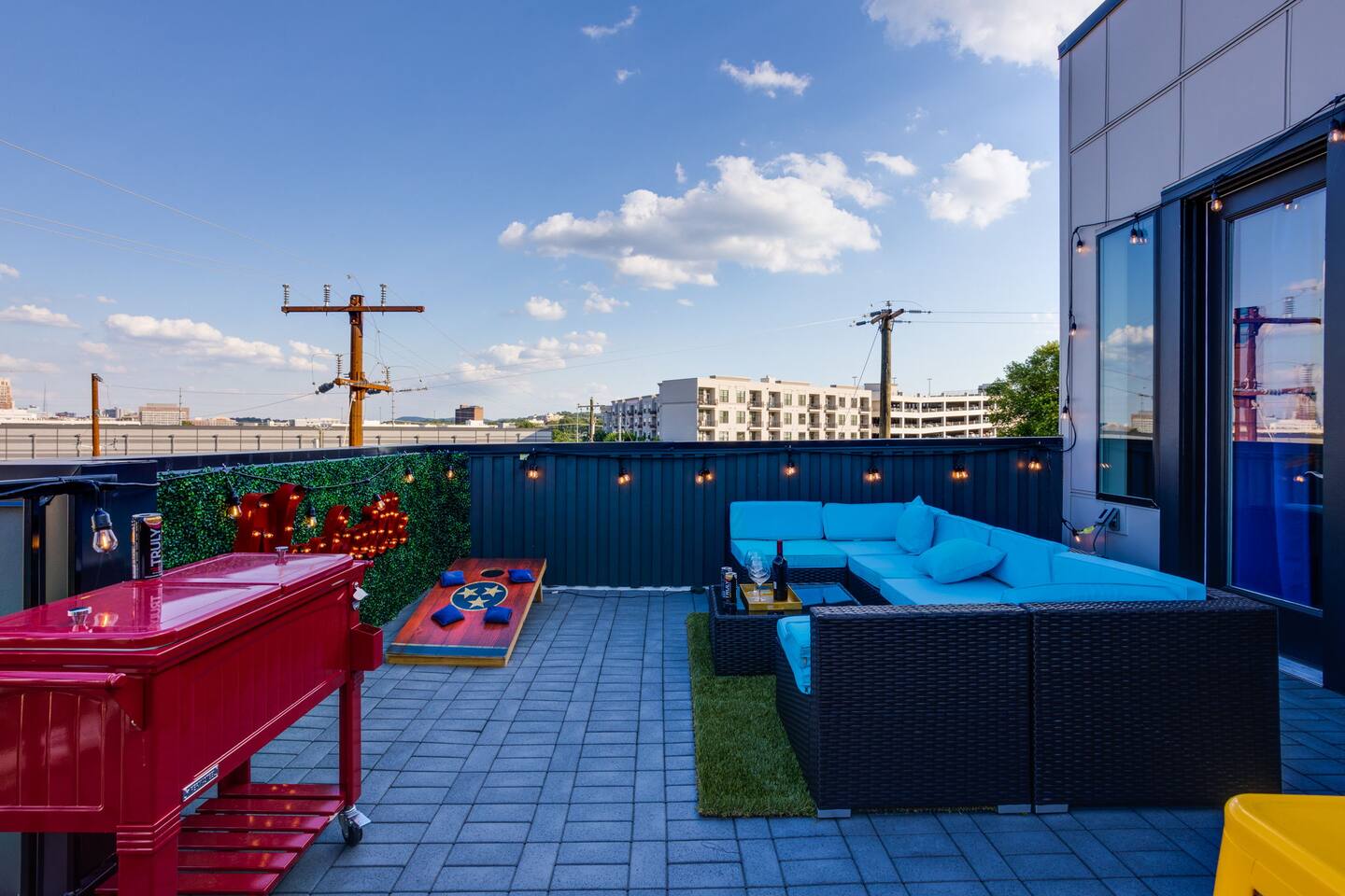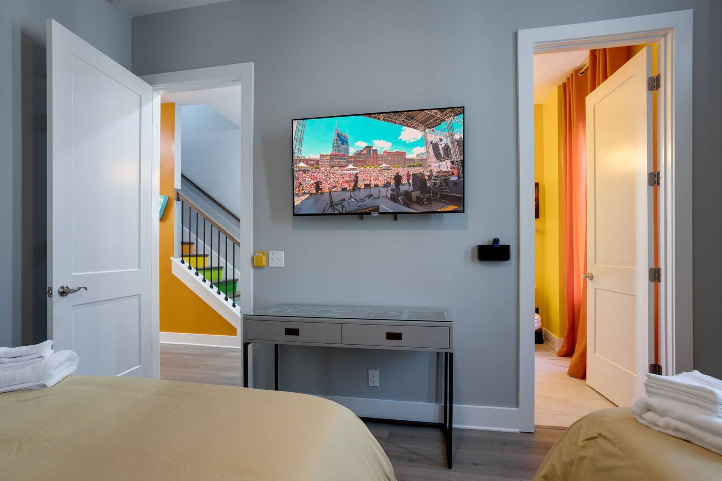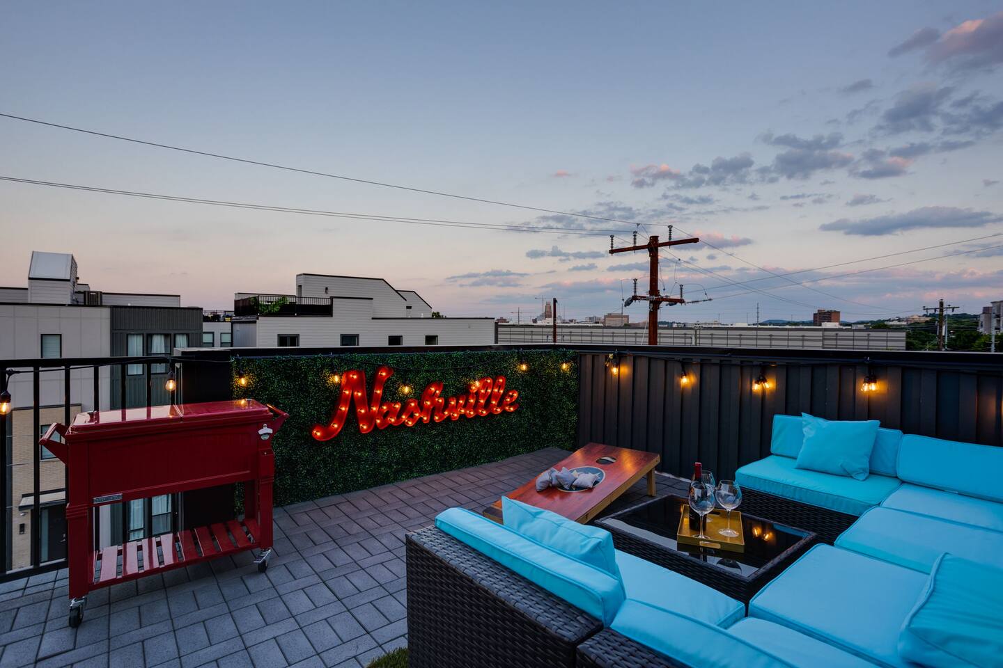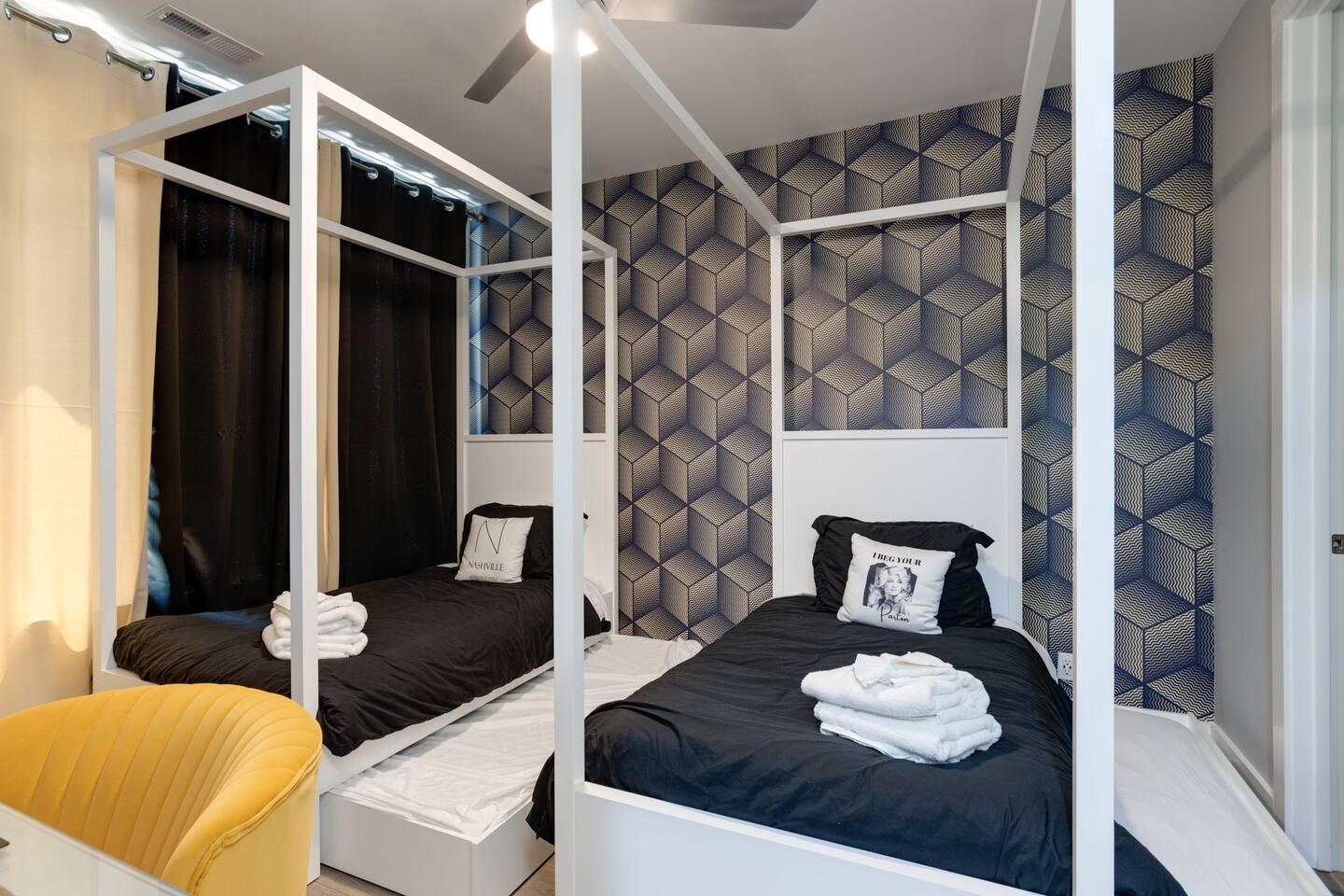 The space Layout: The first floor is comprised of a bedroom with a full bathroom attached. The bed arrangement has 2 twin beds and 2 pullout twin beds below. The second floor is comprised of the second bedroom, with 2 queen size beds, and a full bathroom attached. The third floor has a bedroom bunk set-up with two full size beds and a full bathroom is located in the hall to the left. The master bedroom complete with a king bed is down the hall with a full bathroom attached, featuring a shower with luxury rain fall head. MANAGED AND DESIGNED BY @EXTREMLYSUITE ☆☆☆ LISTING MUST KNOWS ☆☆☆ ★ 2 miles to Downtown Nashville ★ Towels and Linens provided ★ Washer/Dryer ★ Keurig Coffee machine ★ Fully stocked modern kitchen ★ State of the Art Appliances ★ 4 Bedrooms 4 Bathrooms ★ 9 Beds ★ Large Open Concept Living Area ★ Large Rooftop deck with amazing views ★ Indoor Dining ★ Outdoor Lounge space ★ SMART 4k TVs with streaming capability in every bedroom and living room + cable ★ Smart Lock Keyless Entry ★Garage Parking available and free street parking ★Dedicated workspaces throughout the house ★Blazing fast internet ★Garage Game Room with Karaoke/Corn hole Traveling doesn't mean having to eat out for every meal. We supply all of the kitchen necessities so you are able to cook or reheat leftovers easily! We have everything from pots and pans, and a Keurig coffee maker. ☆☆ 9 BEDS ☆☆ ★ Bedroom 1 ....... 4 Single Beds ★ Bedroom 2 ....... 2 Queen Beds ★ Bedroom 3 ....... 2 Double Beds ★ Bedroom 4 ....... 1 King Bed INTERIOR DETAILS Be sure to check out the detailed property photos for more details about the room layout and bed configuration. _ KITCHEN & DINING The home features a gorgeous kitchen and a wide-open living room. For those who love to cook, this is a fully stocked chef's paradise. _ BATHROOMS Most of the bathrooms have single or double vanities and glass showers. Two of the bathrooms have soaking tubs should you be so inclined to take a bubble bath during your stay. We stock the bathrooms with plenty of bath and hand towels, washcloths, cosmetic towels, and floor mats to give you something nice and fluffy to step on when getting out of the shower. You'll also find hairdryers in each bathroom along with plenty of spa-quality shampoos, conditioners, and body wash. _ BEDROOMS Enjoy the cool comfort and support of our Gel-infused Green Tea Memory Foam mattresses and super soft, 480 thread count cotton sateen sheets, woven with a rich, lustrous finish. Each bedroom is equipped with a Roku TV which gives you access to thousands of streaming channels such as Netflix, YouTube TV, Hulu, and Amazon Prime. _ BOARD GAMES You'll find board and card games scattered throughout the home like Uno, Catan, Cards Against Humanity, and more. _ ROOFTOP TERRACE On our rooftop, take in the skyline views of Downtown Nashville, enjoy some chilled drinks in the cooler, test your skills at cornhole, and enjoy the luxurious outdoor furniture. ***No Parties or Events Allowed*** Use bunk beds at your own risk