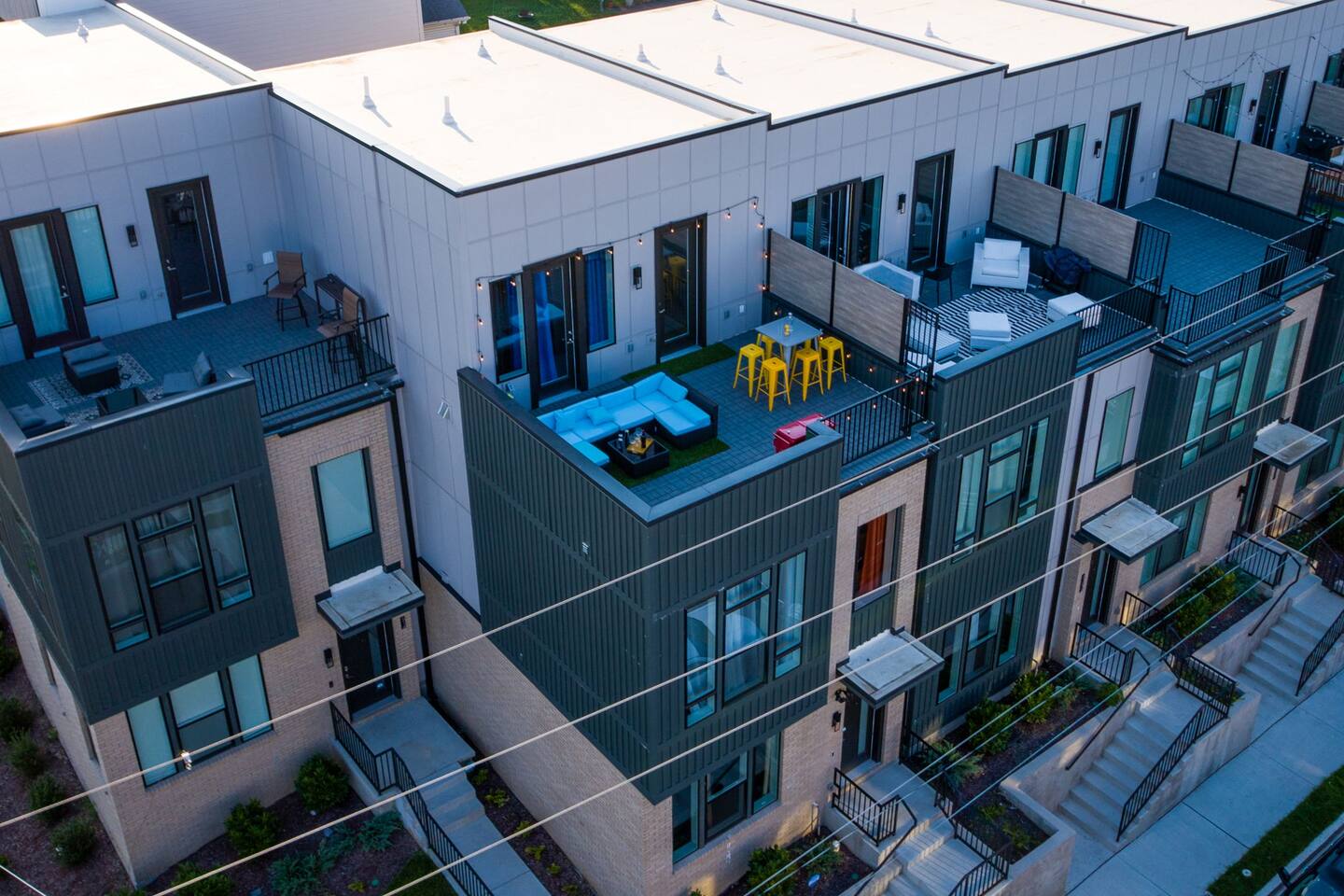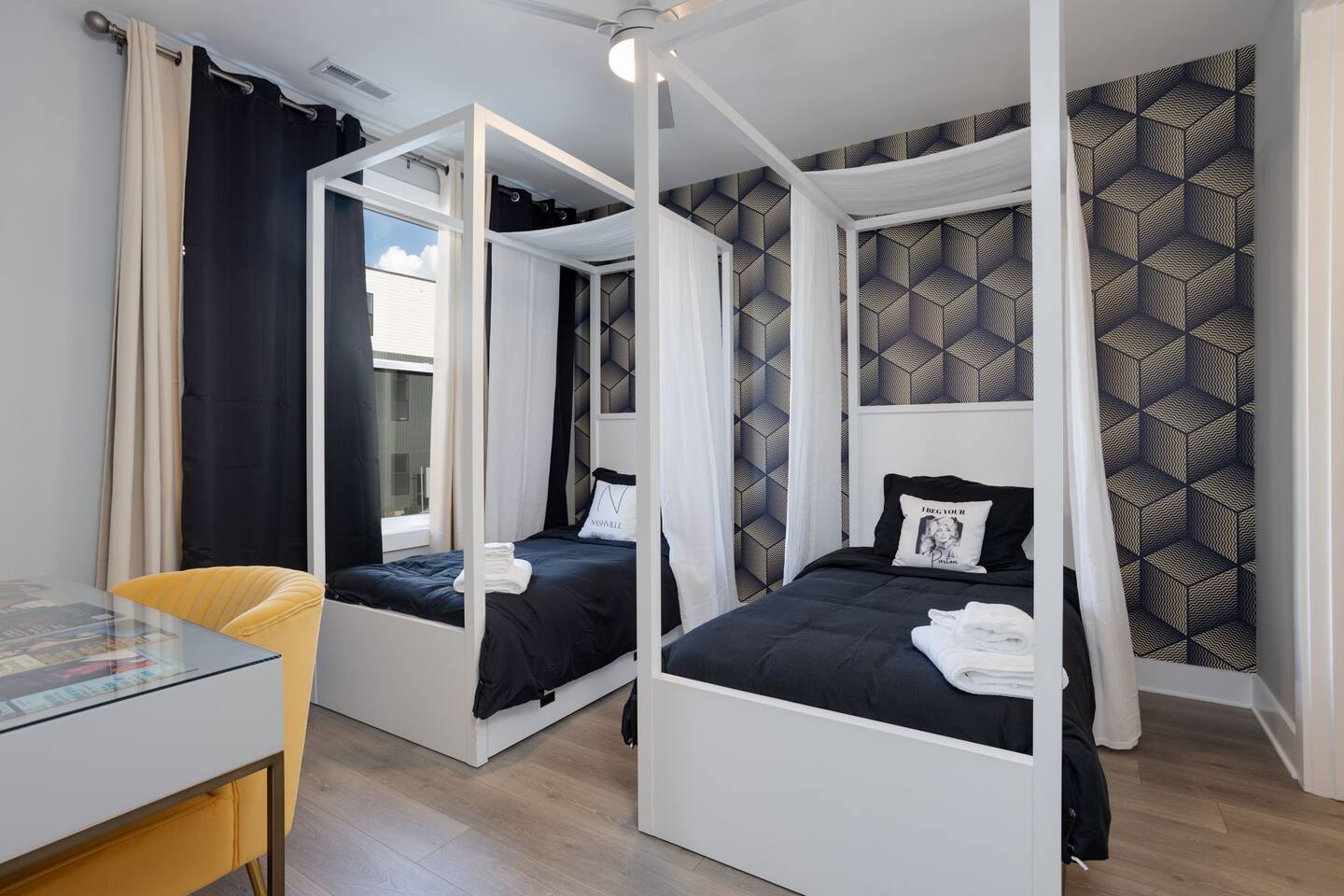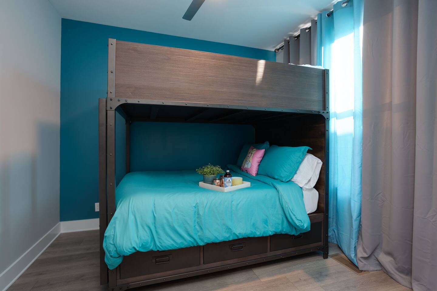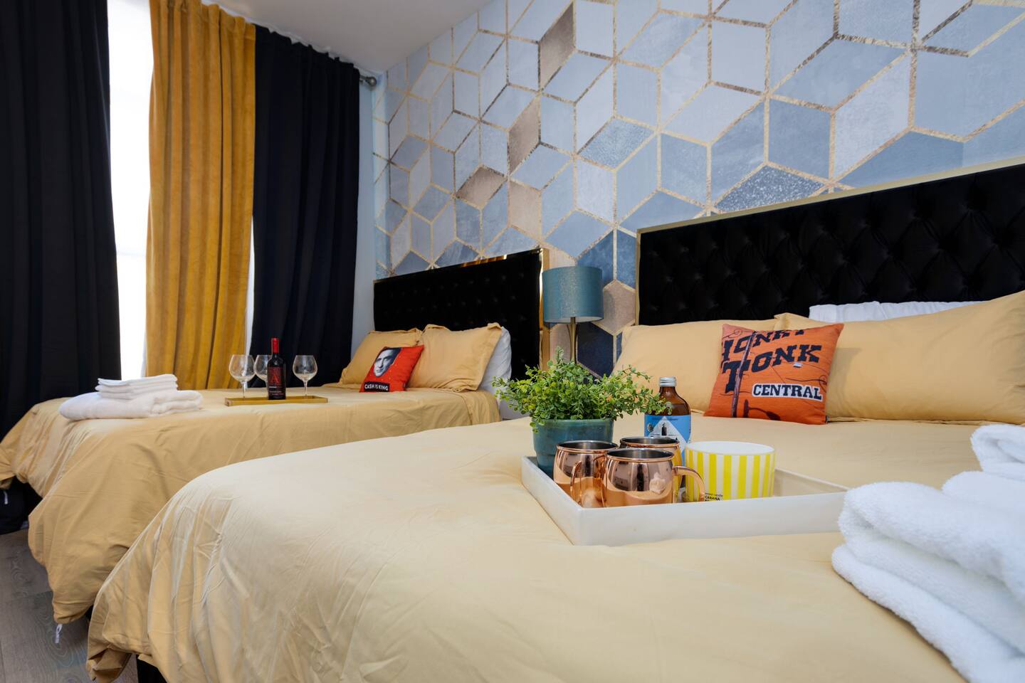The space Layout: The first floor is comprised of a bedroom with a full bathroom attached. The bed arrangement has 2 twin beds and 2 pullout twin beds below. The second floor is comprised of the second bedroom, with 2 queen size beds, and a full bathroom attached. The third floor has a bedroom bunk set-up with two full size beds and a full bathroom is located in the hall to the left. The master bedroom complete with a king bed is down the hall with a full bathroom attached, featuring a shower with luxury rain fall head. MANAGED AND DESIGNED BY @EXTREMLYSUITE ☆☆☆ LISTING MUST KNOWS ☆☆☆ ★ 2 miles to Downtown Nashville ★ Towels and Linens provided ★ Washer/Dryer ★ Keurig Coffee machine ★ Fully stocked modern kitchen ★ State of the Art Appliances ★ 4 Bedrooms 4 Bathrooms ★ 9 Beds ★ Large Open Concept Living Area ★ Large Rooftop deck with amazing views ★ Indoor Dining ★ Outdoor Lounge space ★ SMART 4k TVs with streaming capability in every bedroom and living room + cable ★ Smart Lock Keyless Entry ★Garage Parking available and free street parking ★Dedicated workspaces throughout the house ★Blazing fast internet ★Garage Game Room with Karaoke/Corn hole Traveling doesn't mean having to eat out for every meal. We supply all of the kitchen necessities so you are able to cook or reheat leftovers easily! We have everything from pots and pans, and a Keurig coffee maker. ☆☆ 9 BEDS ☆☆ ★ Bedroom 1 ....... 4 Single Beds ★ Bedroom 2 ....... 2 Queen Beds ★ Bedroom 3 ....... 2 Double Beds ★ Bedroom 4 ....... 1 King Bed INTERIOR DETAILS Be sure to check out the detailed property photos for more details about the room layout and bed configuration. _ KITCHEN & DINING The home features a gorgeous kitchen and a wide-open living room. For those who love to cook, this is a fully stocked chef's paradise. _ BATHROOMS Most of the bathrooms have single or double vanities and glass showers. Two of the bathrooms have soaking tubs should you be so inclined to take a bubble bath during your stay. We stock the bathrooms with plenty of bath and hand towels, washcloths, cosmetic towels, and floor mats to give you something nice and fluffy to step on when getting out of the shower. You'll also find hairdryers in each bathroom along with plenty of spa-quality shampoos, conditioners, and body wash. _ BEDROOMS Enjoy the cool comfort and support of our Gel-infused Green Tea Memory Foam mattresses and super soft, 480 thread count cotton sateen sheets, woven with a rich, lustrous finish. Each bedroom is equipped with a Roku TV which gives you access to thousands of streaming channels such as Netflix, YouTube TV, Hulu, and Amazon Prime. _ BOARD GAMES You'll find board and card games scattered throughout the home like Uno, Catan, Cards Against Humanity, and more. _ ROOFTOP TERRACE On our rooftop, take in the skyline views of Downtown Nashville, enjoy some chilled drinks in the cooler, test your skills at cornhole, and enjoy the luxurious outdoor furniture. ***No Parties or Events Allowed*** Use bunk beds at your own risk