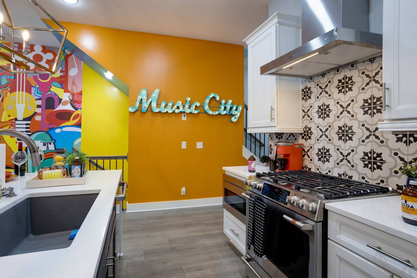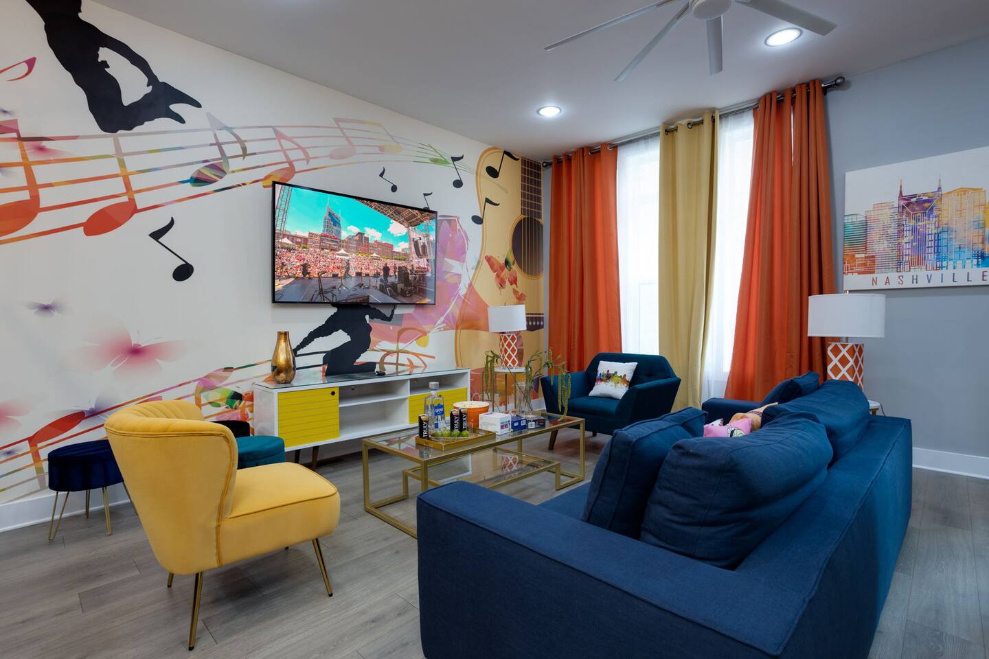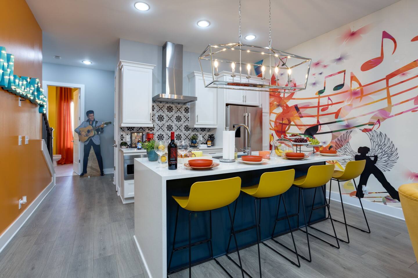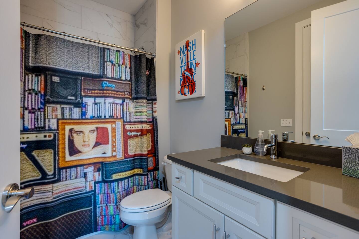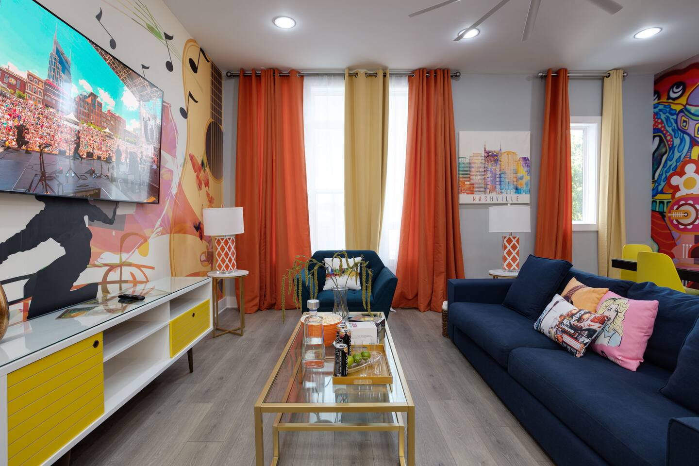 Live within a true work of art and indulge your FIVE senses when you book this stunning luxury rental, "The Six1five"! Floor to ceiling wall designs of iconic Music City themed decor don this stunning 4 bedroom, and 4 bathroom home, making literally every corner of this space a conversation piece to muse about! This home’s sweeping modern architecture also features walls of glass, custom built-in closets, a massive rooftop terrace with downtown views and a garage game room.
