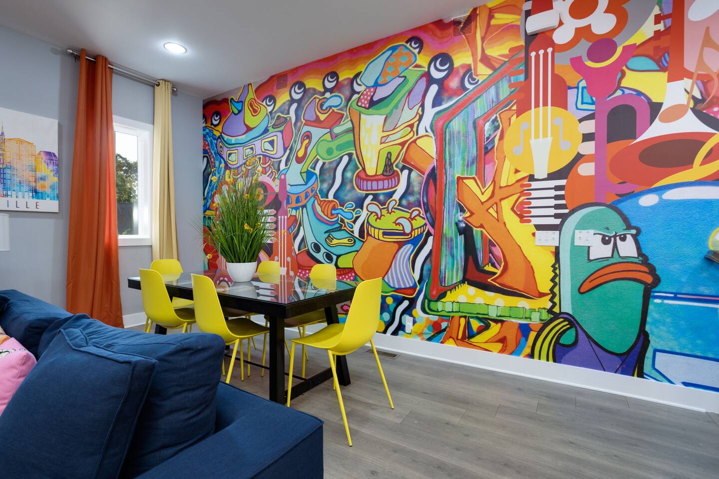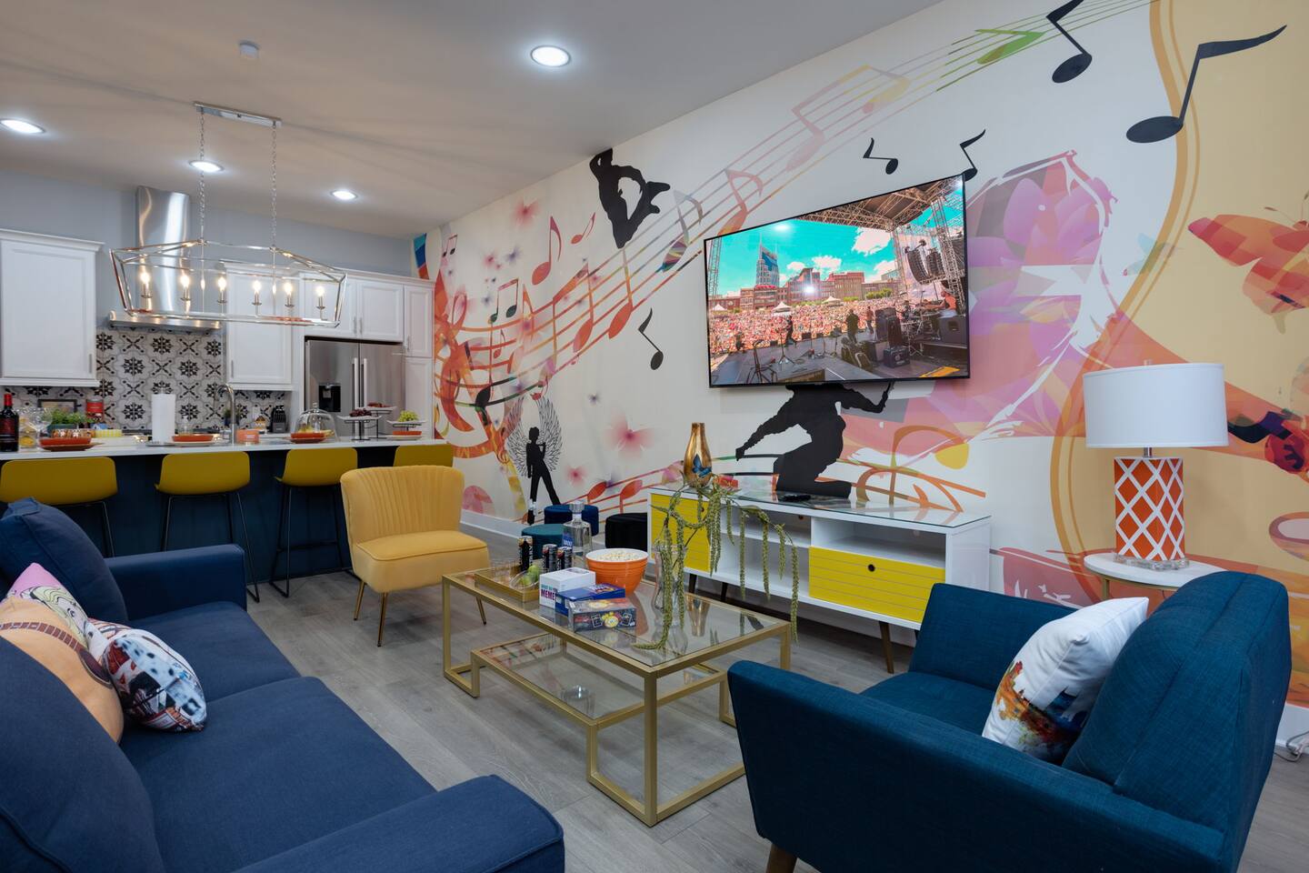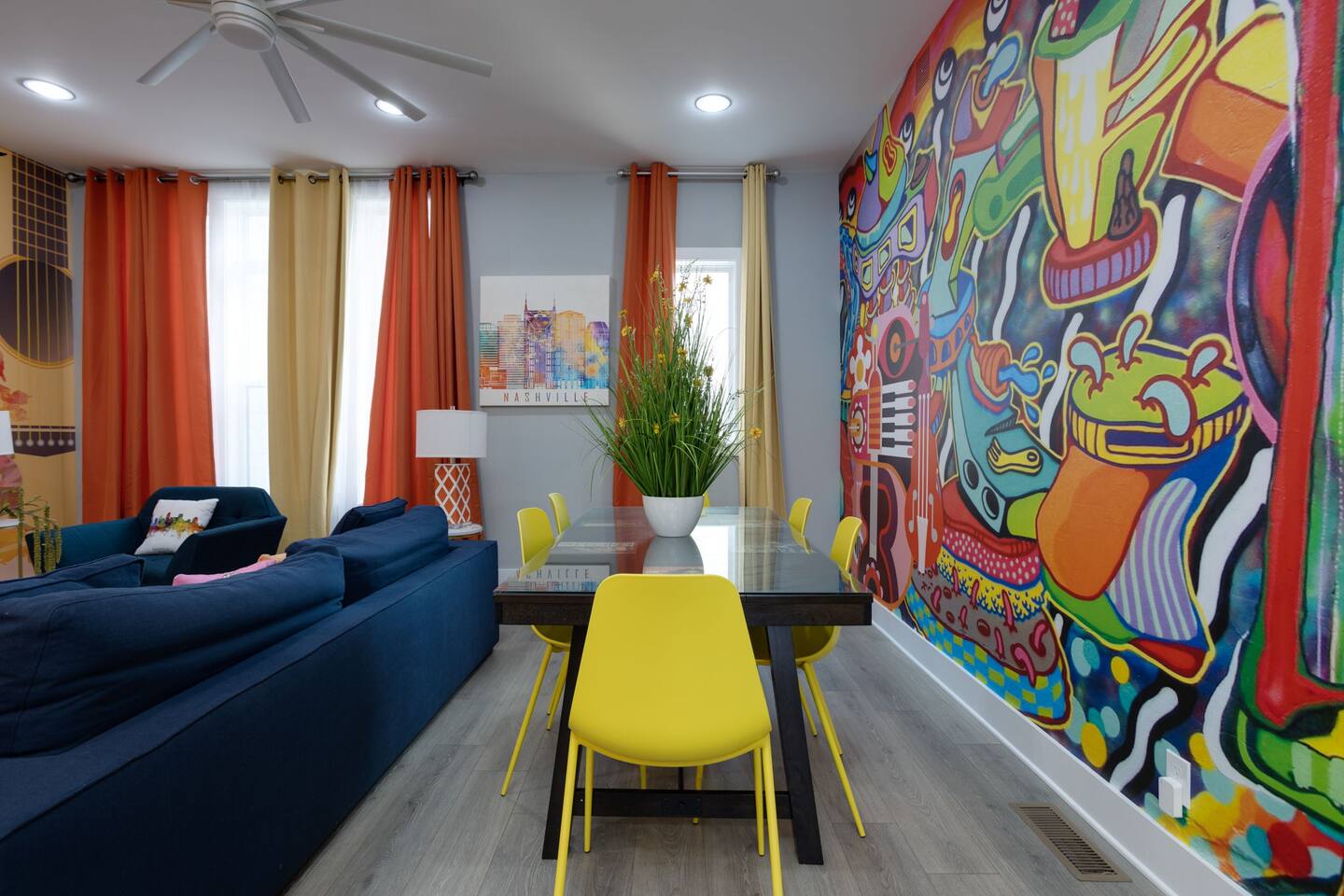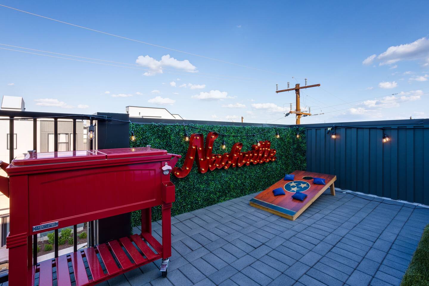 Live within a true work of art and indulge your FIVE senses when you book this stunning luxury rental, "The Six1five"! Floor to ceiling wall designs of iconic Music City themed decor don this stunning 4 bedroom, and 4 bathroom home, making literally every corner of this space a conversation piece to muse about! This home’s sweeping modern architecture also features walls of glass, custom built-in closets, a massive rooftop terrace with downtown views and a garage game room.