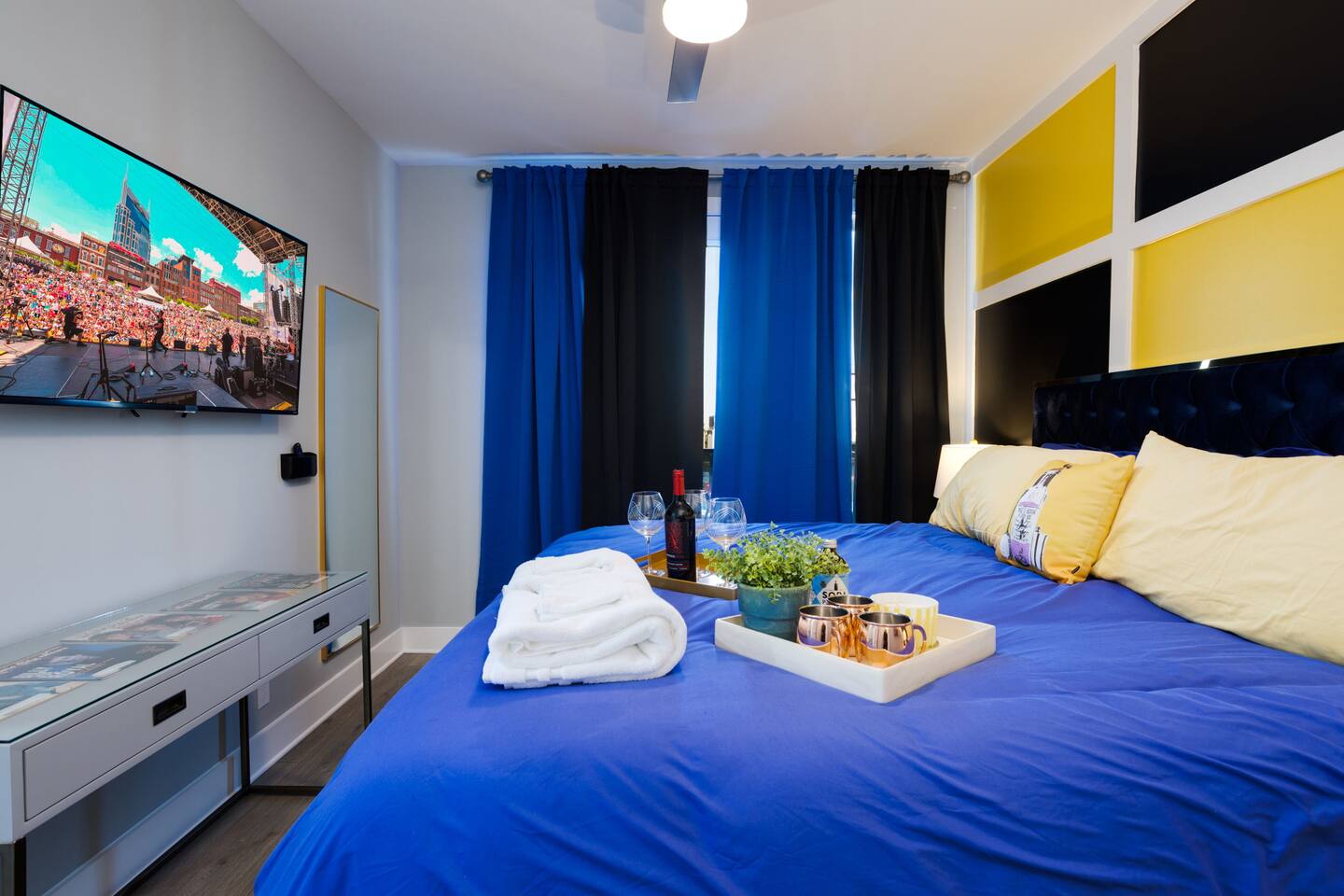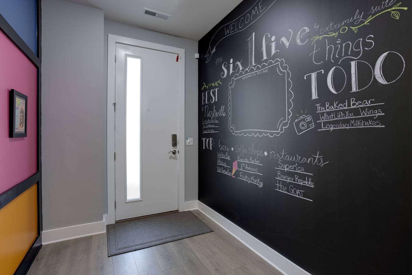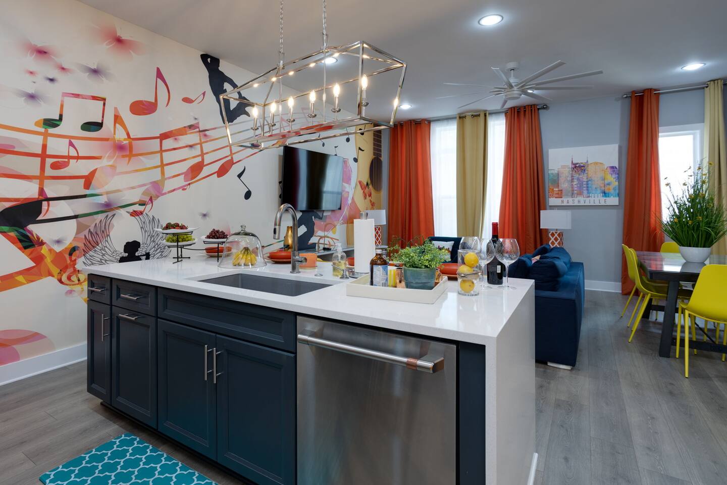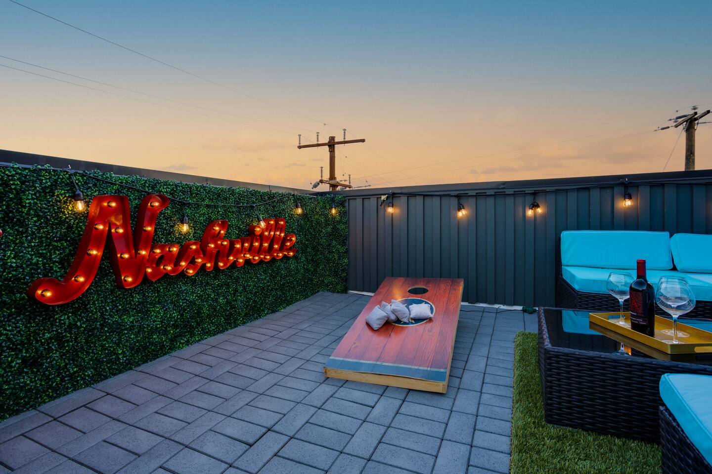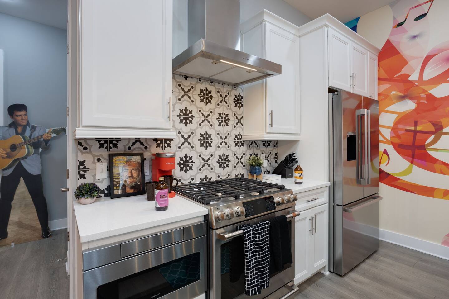 Live within a true work of art and indulge your FIVE senses when you book this stunning luxury rental, "The Six1five"! Floor to ceiling wall designs of iconic Music City themed decor don this stunning 4 bedroom, and 4 bathroom home, making literally every corner of this space a conversation piece to muse about! This home’s sweeping modern architecture also features walls of glass, custom built-in closets, a massive rooftop terrace with downtown views and a garage game room.
