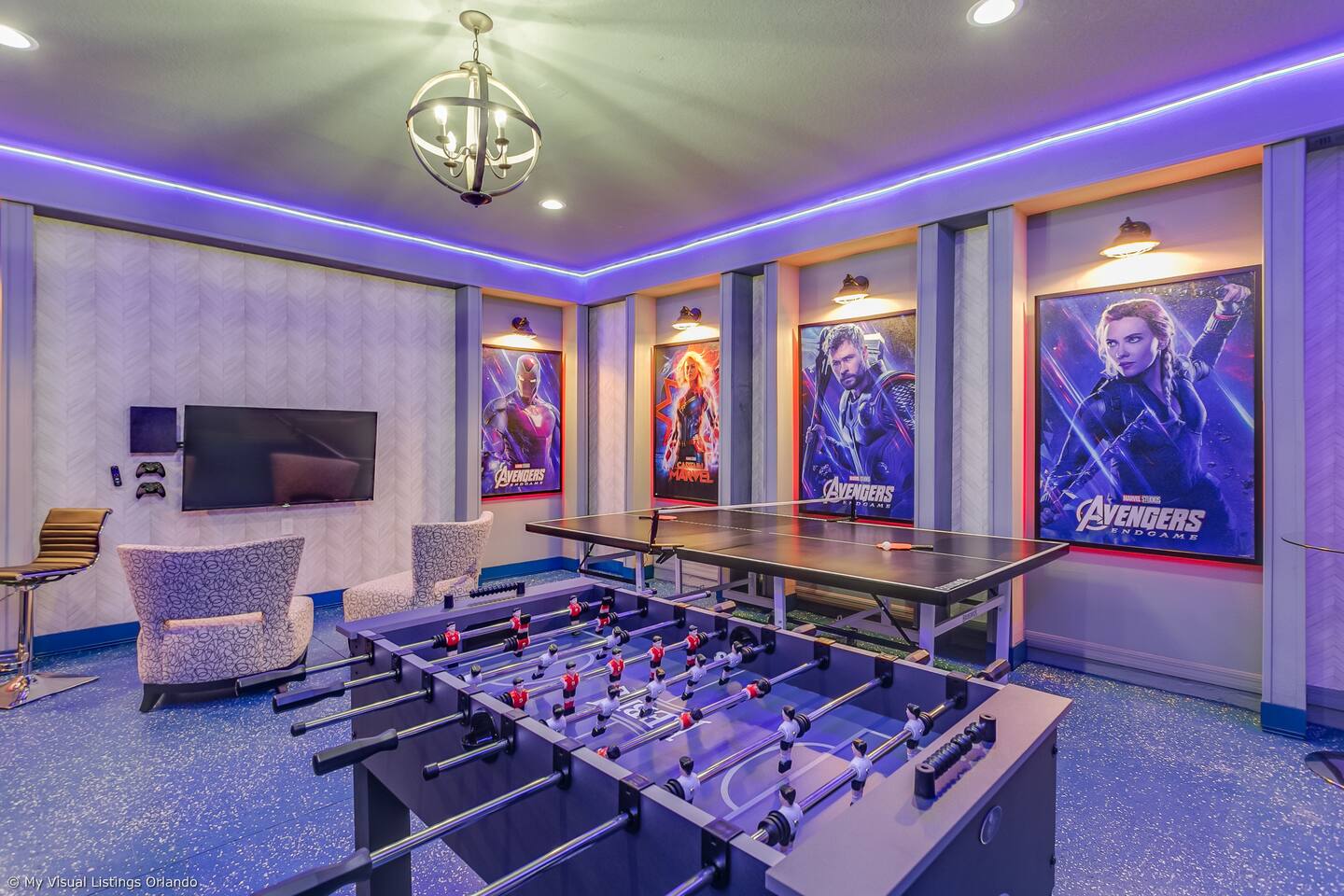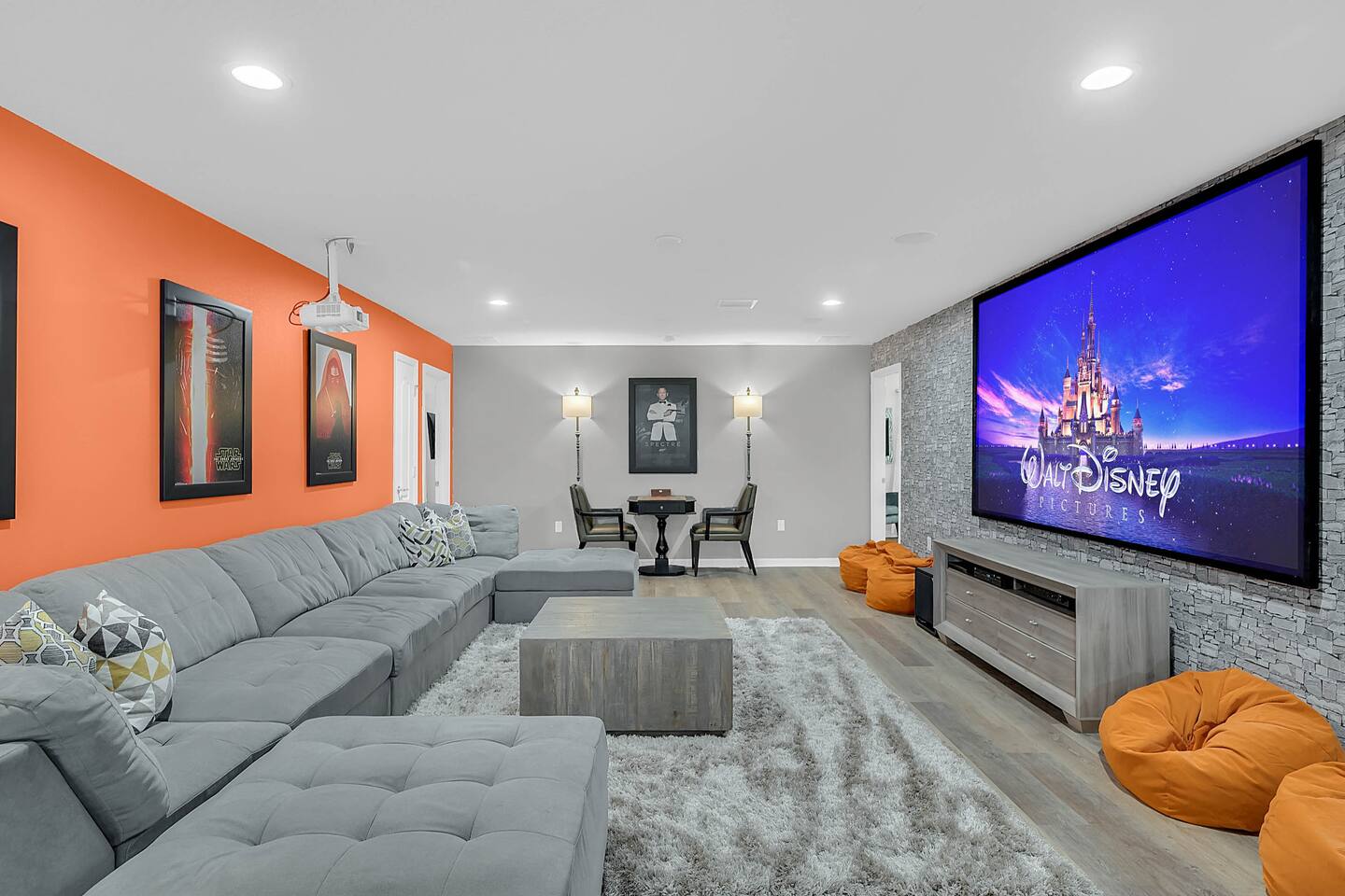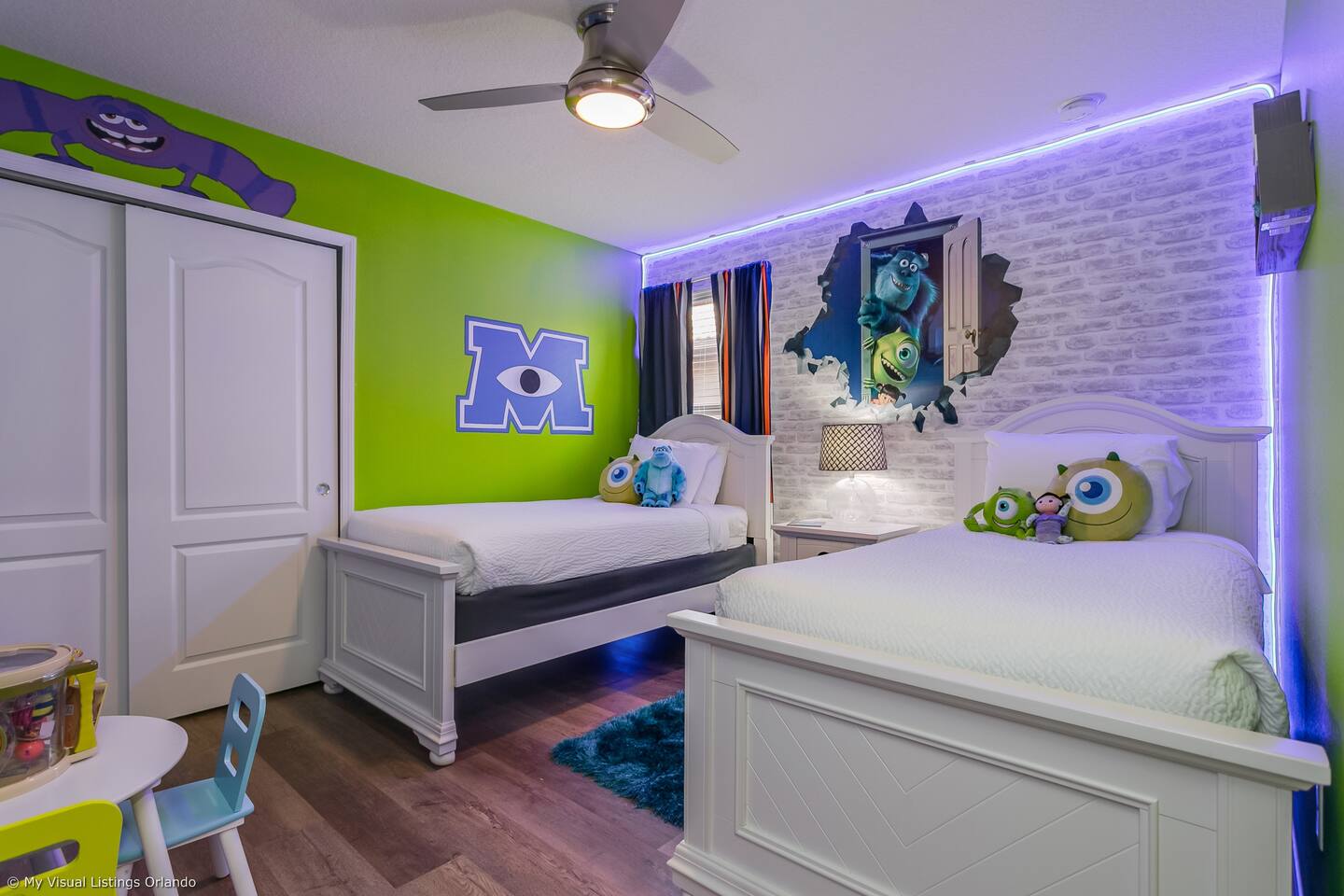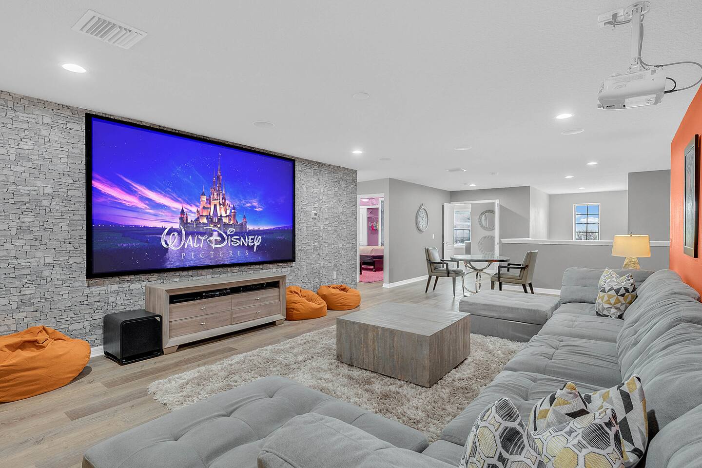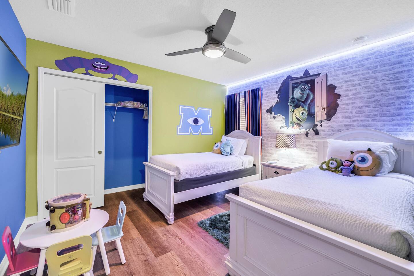The Southern Wonder of the World | Must See - One of the Best Homes in Windsor at Westside Property Summary Professionally designed and furnished by one of the country’s foremost and world renowned design experts the appropriately named, Southern Wonder of the World, is one of Florida’s most unique vacation properties. The property has all that a family or large group needs for a completely immersive entertainment experience. With a private swimming pool, luxurious bedroom furnishings, themed kids rooms, State of the Art game room, and Movie Theater room, you can spend a whole day relaxing or having fun. With 4,000+ sq. ft. to share with your family or group coupled with the pool deck, this home holds up to 16+ guests. The home is also hypoallergenic with no carpeting in the home and a ceiling fan in each bedroom to aide fresh air flow throughout the home. The home is a short walk from the state-of the art clubhouse at Windsor at Westside. What a great place for families to share! The game room is air-conditioned and fully stocked with action! Feeling competitive? Up for some games? Here you can find foosball, Marvel Air Hockey, Ping-pong, an XBOX station with a large screen TV, and an additional large flat screen TV for watching your favorite movies or sports. Be amazed and immerse yourself in the “Marvel” room and be sure to take a picture next to your favorite Marvel character! The pool area is where you can enjoy the sun, the fresh air, and the refreshing pool water. There are sun loungers and a spillover spa for complete relaxation. For added safety, the pool deck comes equipped with a safety fence. The kitchen is fully equipped with all of your needs from stainless steel appliances, to a toaster and coffee maker. The home has a spacious open floor plan and sits on one of the best lots in Windsor at Westside. The dining area has seating for 16+ where bellies are made full and memories are sure to be created. The breakfast bar also has 4 amazing bar stools to accommodate more family time together. The living room has a huge modern 84" fan. By day watch your favorite shows on the wall mounted 75" LED TV, then in the evenings enjoy movies and sports on the 120" projector screen complete with theater-like seating, complete state of the art surround sound system, and subwoofer. Upstairs there is a huge Princess immersive experience themed kids bedroom complete with dynamic fiber optic lighting, hand painted effects, LED lighting, Princess themed dynamic effects, and other Princess amazement. There is also an amazing custom-built Monsters themed bedroom complete with custom LED lighting, kids toys, special themed furniture, custom painted walls, murals, and custom shelving. Features: • 8 Bedrooms and 6 Full Bathrooms • Covered Lanai with Heated Pool/Spa (no rear neighbors for privacy) • Outside Dining Table and Dining Bar • Well equipped Kitchen with Counter Stools and Extra-Large Dining Table • Large Gathering Room with 75” 4k Smart TV/Multi-Region Blu Ray • Second Floor Games Room with Movie Theater • Xbox 360 • Surround Sound System • Poker and numerous Board Games and DVDs to cater for all ages • Additional Games Room with Table Tennis, Foosball, and Air Hockey • Smart TVs with Netflix in every Bedroom • Complimentary Cable TV, High-Speed WIFI and free calls to Canada and U.S. • A/C and ceiling fans in every room to maximize comfort • Baby equipment provided at no charge (pack and play, highchair) • Full Washer/Dryer, Linen and Towels provided • Hair Dryers, Ironing Board & Iron Sleeps 16: • Suite 1- King Bed • Suite 2- King Bed • Suite 3- King Bed • Suite 4- Queen Bed • Bed 5- Two Twin Beds • Bed 6- Two Twin Beds • Bed 7- Queen Bed • Bed 8- Queen Bed