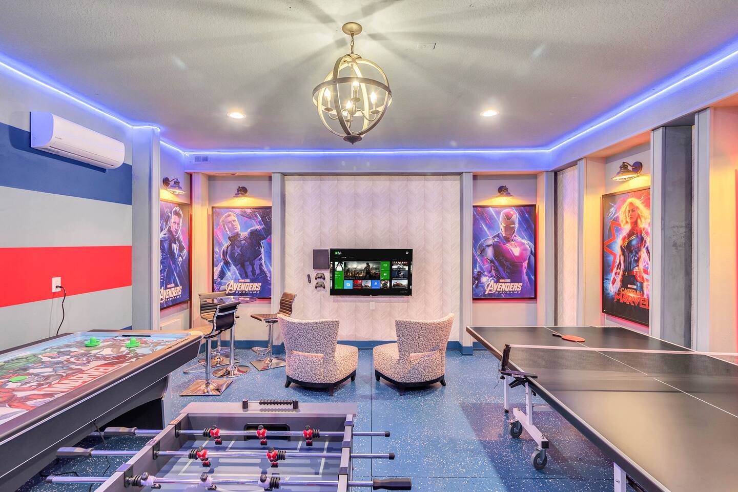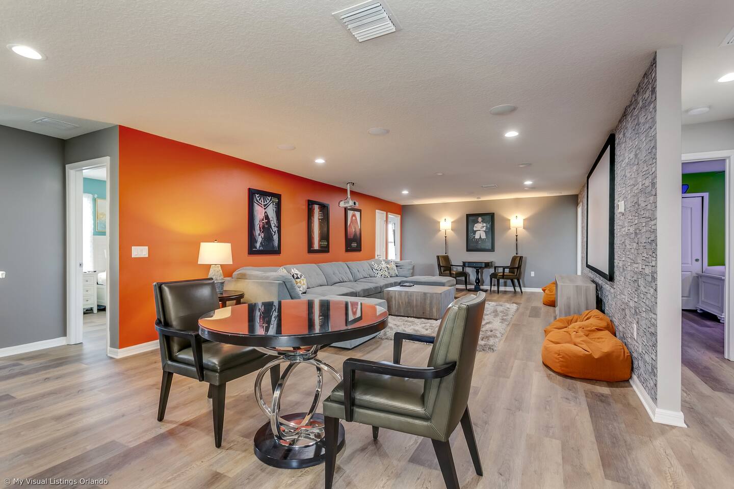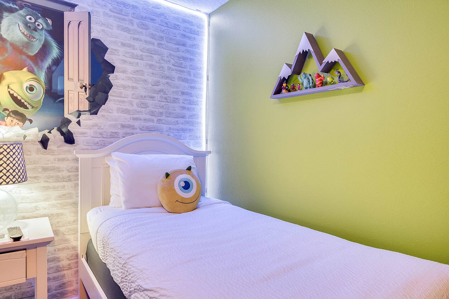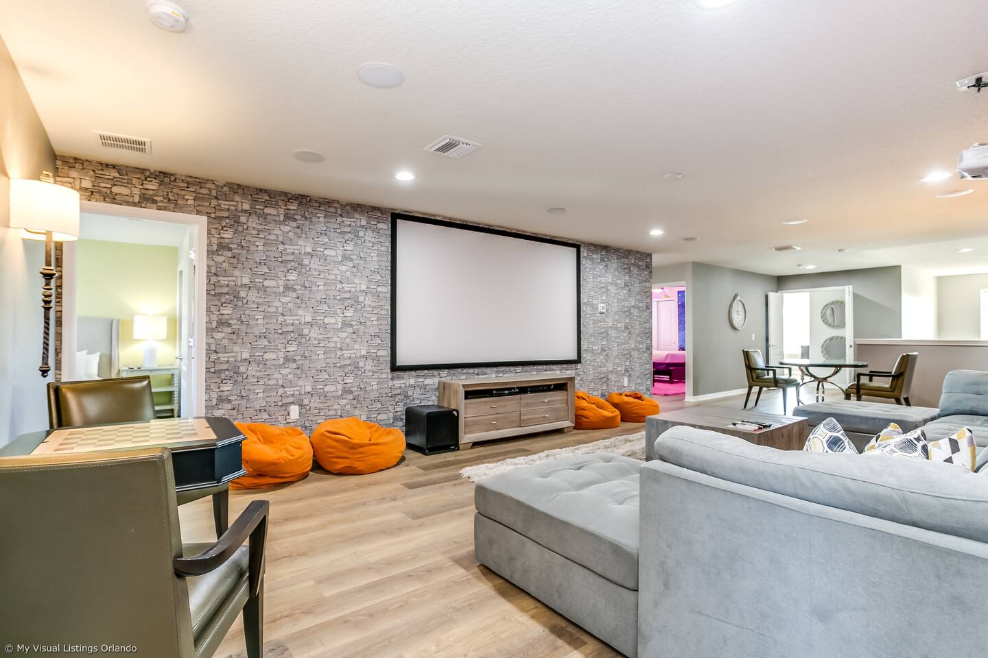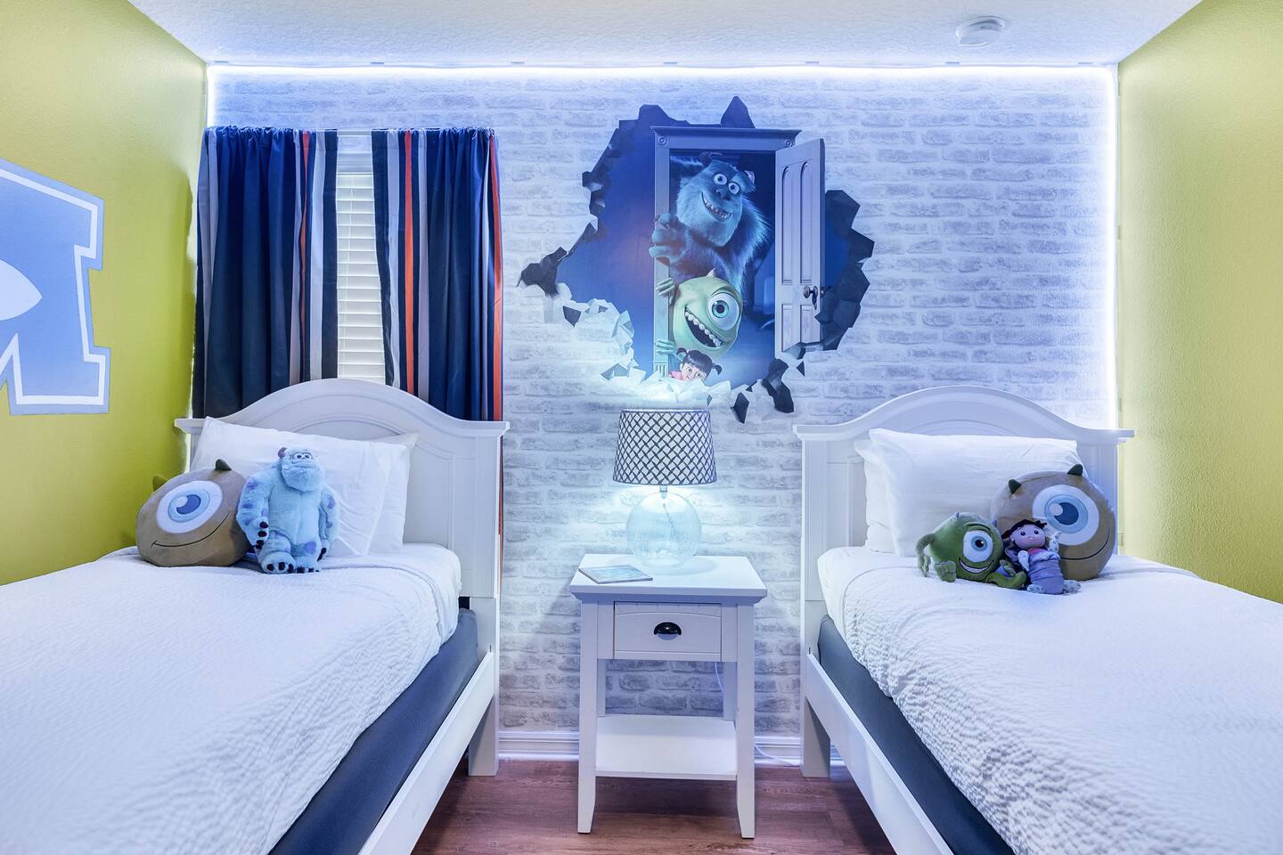 The Southern Wonder of the World | Must See - One of the Best Homes in Windsor at Westside Property Summary Professionally designed and furnished by one of the country’s foremost and world renowned design experts the appropriately named, Southern Wonder of the World, is one of Florida’s most unique vacation properties. The property has all that a family or large group needs for a completely immersive entertainment experience. With a private swimming pool, luxurious bedroom furnishings, themed kids rooms, State of the Art game room, and Movie Theater room, you can spend a whole day relaxing or having fun. With 4,000+ sq. ft. to share with your family or group coupled with the pool deck, this home holds up to 16+ guests. The home is also hypoallergenic with no carpeting in the home and a ceiling fan in each bedroom to aide fresh air flow throughout the home. The home is a short walk from the state-of the art clubhouse at Windsor at Westside. What a great place for families to share! The game room is air-conditioned and fully stocked with action! Feeling competitive? Up for some games? Here you can find foosball, Marvel Air Hockey, Ping-pong, an XBOX station with a large screen TV, and an additional large flat screen TV for watching your favorite movies or sports. Be amazed and immerse yourself in the “Marvel” room and be sure to take a picture next to your favorite Marvel character! The pool area is where you can enjoy the sun, the fresh air, and the refreshing pool water. There are sun loungers and a spillover spa for complete relaxation. For added safety, the pool deck comes equipped with a safety fence. The kitchen is fully equipped with all of your needs from stainless steel appliances, to a toaster and coffee maker. The home has a spacious open floor plan and sits on one of the best lots in Windsor at Westside. The dining area has seating for 16+ where bellies are made full and memories are sure to be created. The breakfast bar also has 4 amazing bar stools to accommodate more family time together. The living room has a huge modern 84" fan. By day watch your favorite shows on the wall mounted 75" LED TV, then in the evenings enjoy movies and sports on the 120" projector screen complete with theater-like seating, complete state of the art surround sound system, and subwoofer. Upstairs there is a huge Princess immersive experience themed kids bedroom complete with dynamic fiber optic lighting, hand painted effects, LED lighting, Princess themed dynamic effects, and other Princess amazement. There is also an amazing custom-built Monsters themed bedroom complete with custom LED lighting, kids toys, special themed furniture, custom painted walls, murals, and custom shelving. Features: • 8 Bedrooms and 6 Full Bathrooms • Covered Lanai with Heated Pool/Spa (no rear neighbors for privacy) • Outside Dining Table and Dining Bar • Well equipped Kitchen with Counter Stools and Extra-Large Dining Table • Large Gathering Room with 75” 4k Smart TV/Multi-Region Blu Ray • Second Floor Games Room with Movie Theater • Xbox 360 • Surround Sound System • Poker and numerous Board Games and DVDs to cater for all ages • Additional Games Room with Table Tennis, Foosball, and Air Hockey • Smart TVs with Netflix in every Bedroom • Complimentary Cable TV, High-Speed WIFI and free calls to Canada and U.S. • A/C and ceiling fans in every room to maximize comfort • Baby equipment provided at no charge (pack and play, highchair) • Full Washer/Dryer, Linen and Towels provided • Hair Dryers, Ironing Board & Iron Sleeps 16: • Suite 1- King Bed • Suite 2- King Bed • Suite 3- King Bed • Suite 4- Queen Bed • Bed 5- Two Twin Beds • Bed 6- Two Twin Beds • Bed 7- Queen Bed • Bed 8- Queen Bed