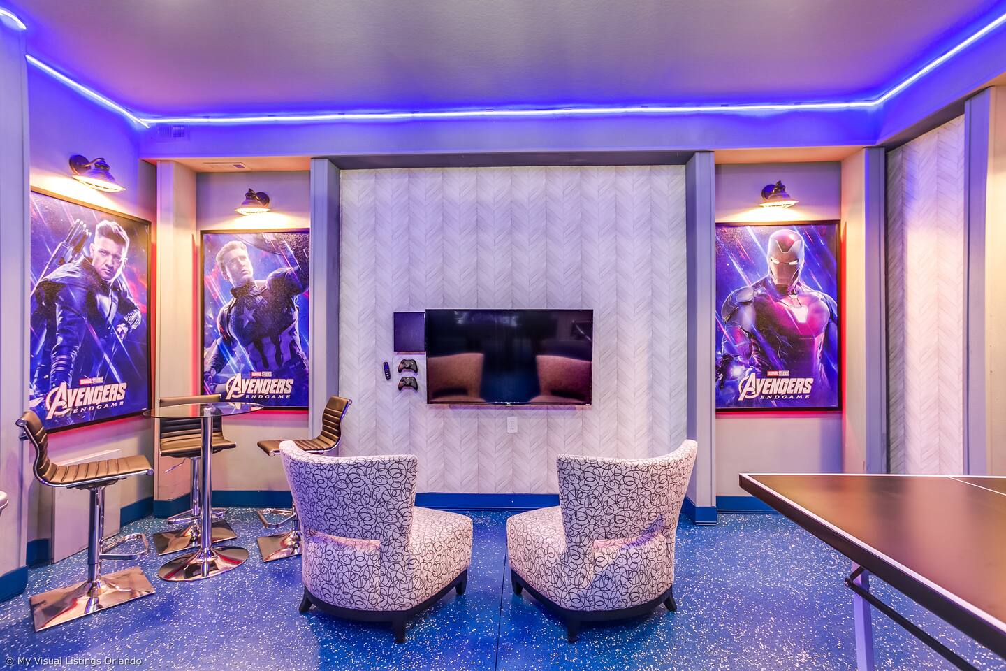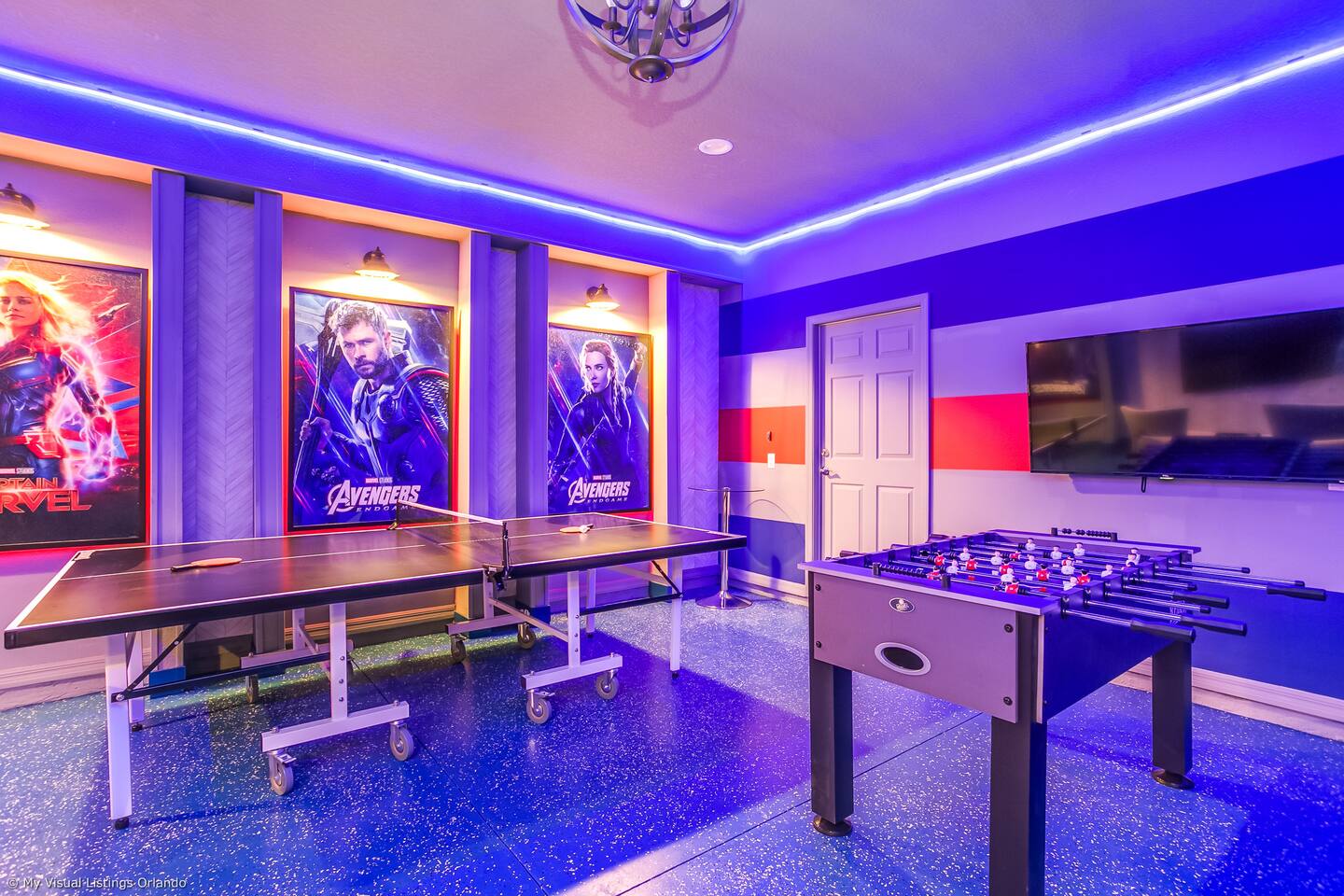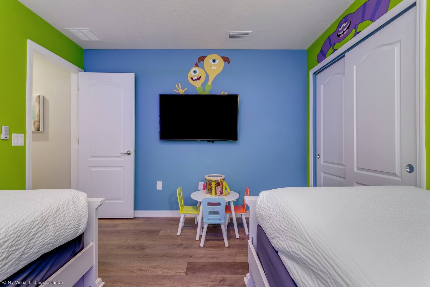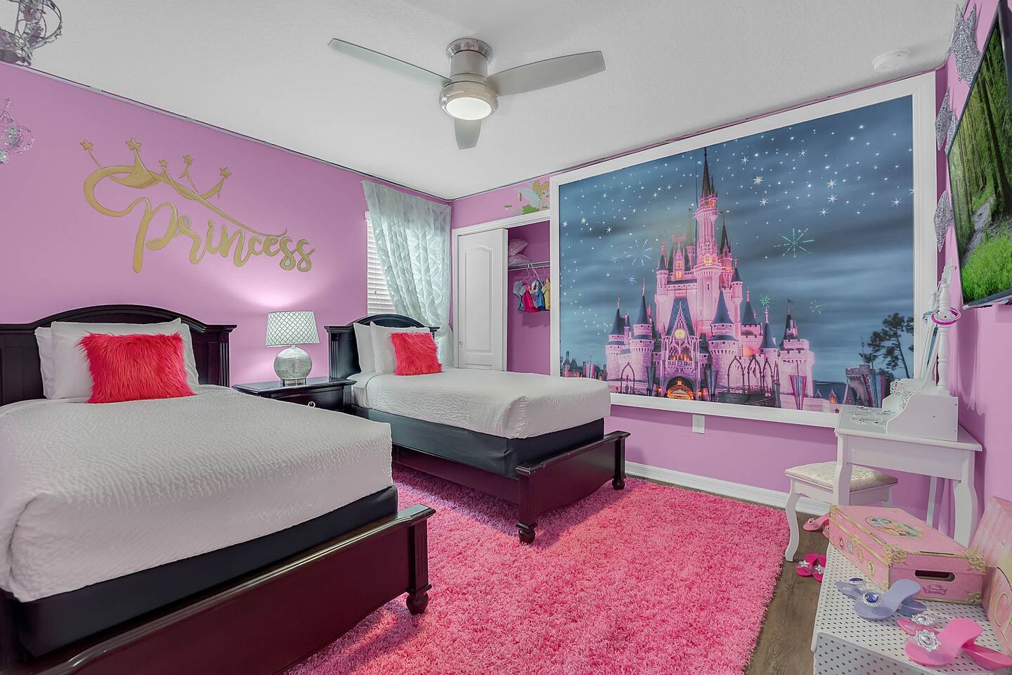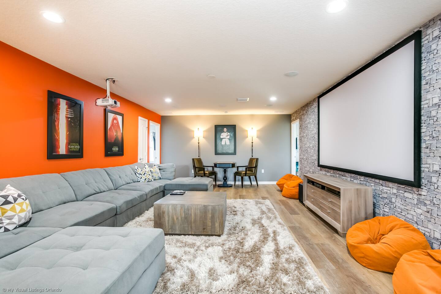 The Southern Wonder of the World | Must See - One of the Best Homes in Windsor at Westside Property Summary Professionally designed and furnished by one of the country’s foremost and world renowned design experts the appropriately named, Southern Wonder of the World, is one of Florida’s most unique vacation properties. The property has all that a family or large group needs for a completely immersive entertainment experience. With a private swimming pool, luxurious bedroom furnishings, themed kids rooms, State of the Art game room, and Movie Theater room, you can spend a whole day relaxing or having fun. With 4,000+ sq. ft. to share with your family or group coupled with the pool deck, this home holds up to 16+ guests. The home is also hypoallergenic with no carpeting in the home and a ceiling fan in each bedroom to aide fresh air flow throughout the home. The home is a short walk from the state-of the art clubhouse at Windsor at Westside. What a great place for families to share! The game room is air-conditioned and fully stocked with action! Feeling competitive? Up for some games? Here you can find foosball, Marvel Air Hockey, Ping-pong, an XBOX station with a large screen TV, and an additional large flat screen TV for watching your favorite movies or sports. Be amazed and immerse yourself in the “Marvel” room and be sure to take a picture next to your favorite Marvel character! The pool area is where you can enjoy the sun, the fresh air, and the refreshing pool water. There are sun loungers and a spillover spa for complete relaxation. For added safety, the pool deck comes equipped with a safety fence. The kitchen is fully equipped with all of your needs from stainless steel appliances, to a toaster and coffee maker. The home has a spacious open floor plan and sits on one of the best lots in Windsor at Westside. The dining area has seating for 16+ where bellies are made full and memories are sure to be created. The breakfast bar also has 4 amazing bar stools to accommodate more family time together. The living room has a huge modern 84" fan. By day watch your favorite shows on the wall mounted 75" LED TV, then in the evenings enjoy movies and sports on the 120" projector screen complete with theater-like seating, complete state of the art surround sound system, and subwoofer. Upstairs there is a huge Princess immersive experience themed kids bedroom complete with dynamic fiber optic lighting, hand painted effects, LED lighting, Princess themed dynamic effects, and other Princess amazement. There is also an amazing custom-built Monsters themed bedroom complete with custom LED lighting, kids toys, special themed furniture, custom painted walls, murals, and custom shelving. Features: • 8 Bedrooms and 6 Full Bathrooms • Covered Lanai with Heated Pool/Spa (no rear neighbors for privacy) • Outside Dining Table and Dining Bar • Well equipped Kitchen with Counter Stools and Extra-Large Dining Table • Large Gathering Room with 75” 4k Smart TV/Multi-Region Blu Ray • Second Floor Games Room with Movie Theater • Xbox 360 • Surround Sound System • Poker and numerous Board Games and DVDs to cater for all ages • Additional Games Room with Table Tennis, Foosball, and Air Hockey • Smart TVs with Netflix in every Bedroom • Complimentary Cable TV, High-Speed WIFI and free calls to Canada and U.S. • A/C and ceiling fans in every room to maximize comfort • Baby equipment provided at no charge (pack and play, highchair) • Full Washer/Dryer, Linen and Towels provided • Hair Dryers, Ironing Board & Iron Sleeps 16: • Suite 1- King Bed • Suite 2- King Bed • Suite 3- King Bed • Suite 4- Queen Bed • Bed 5- Two Twin Beds • Bed 6- Two Twin Beds • Bed 7- Queen Bed • Bed 8- Queen Bed