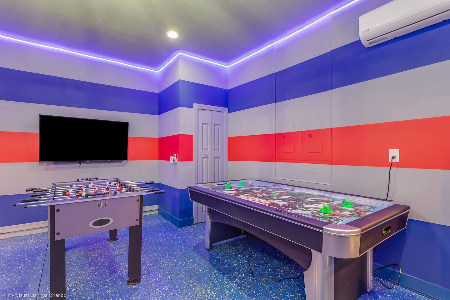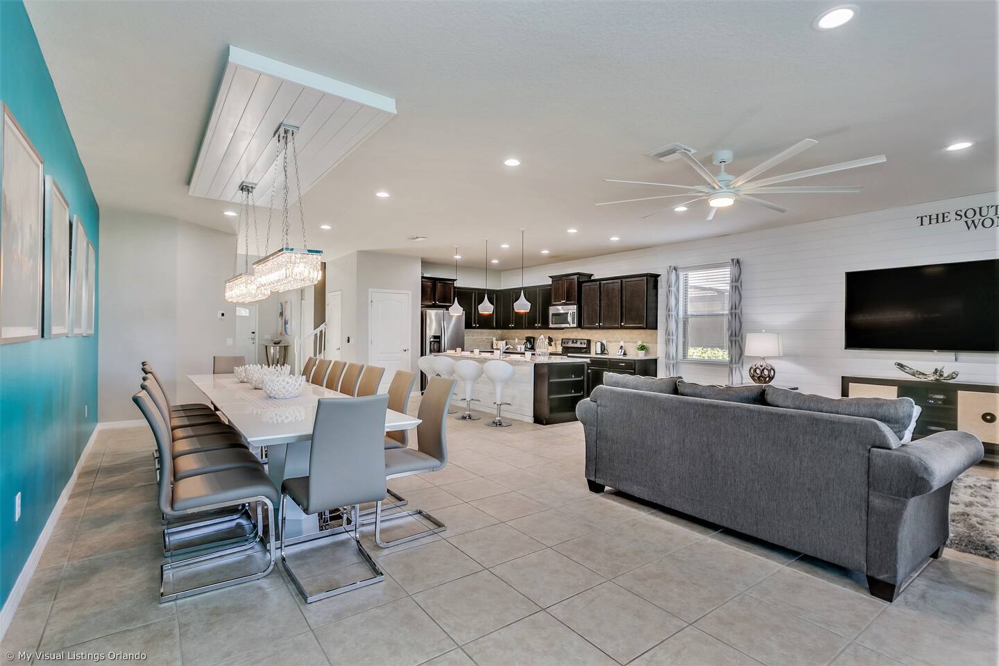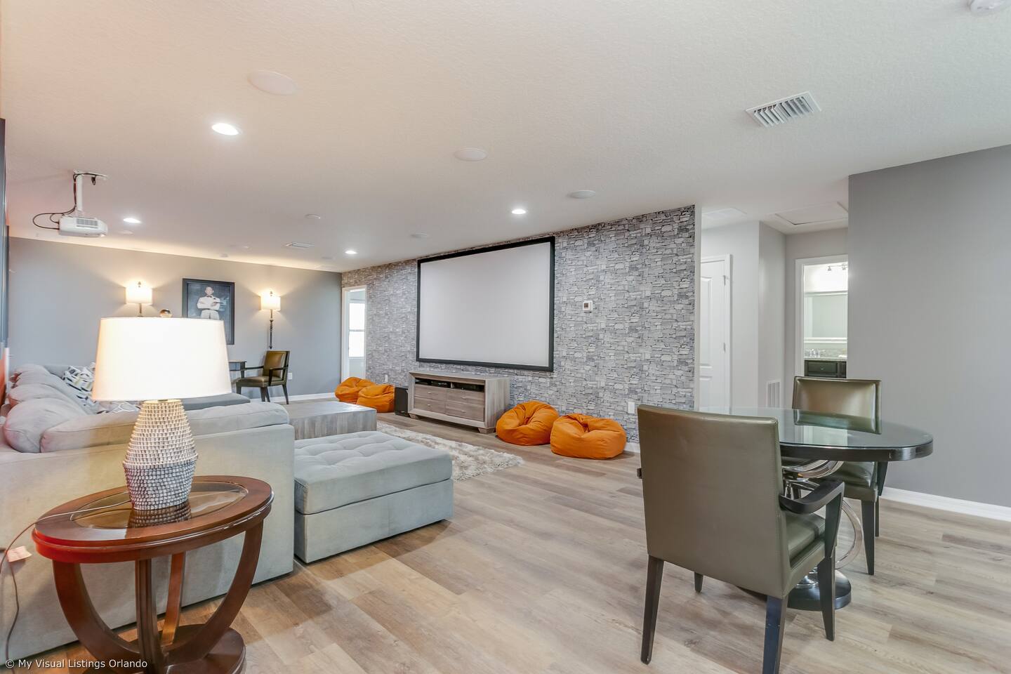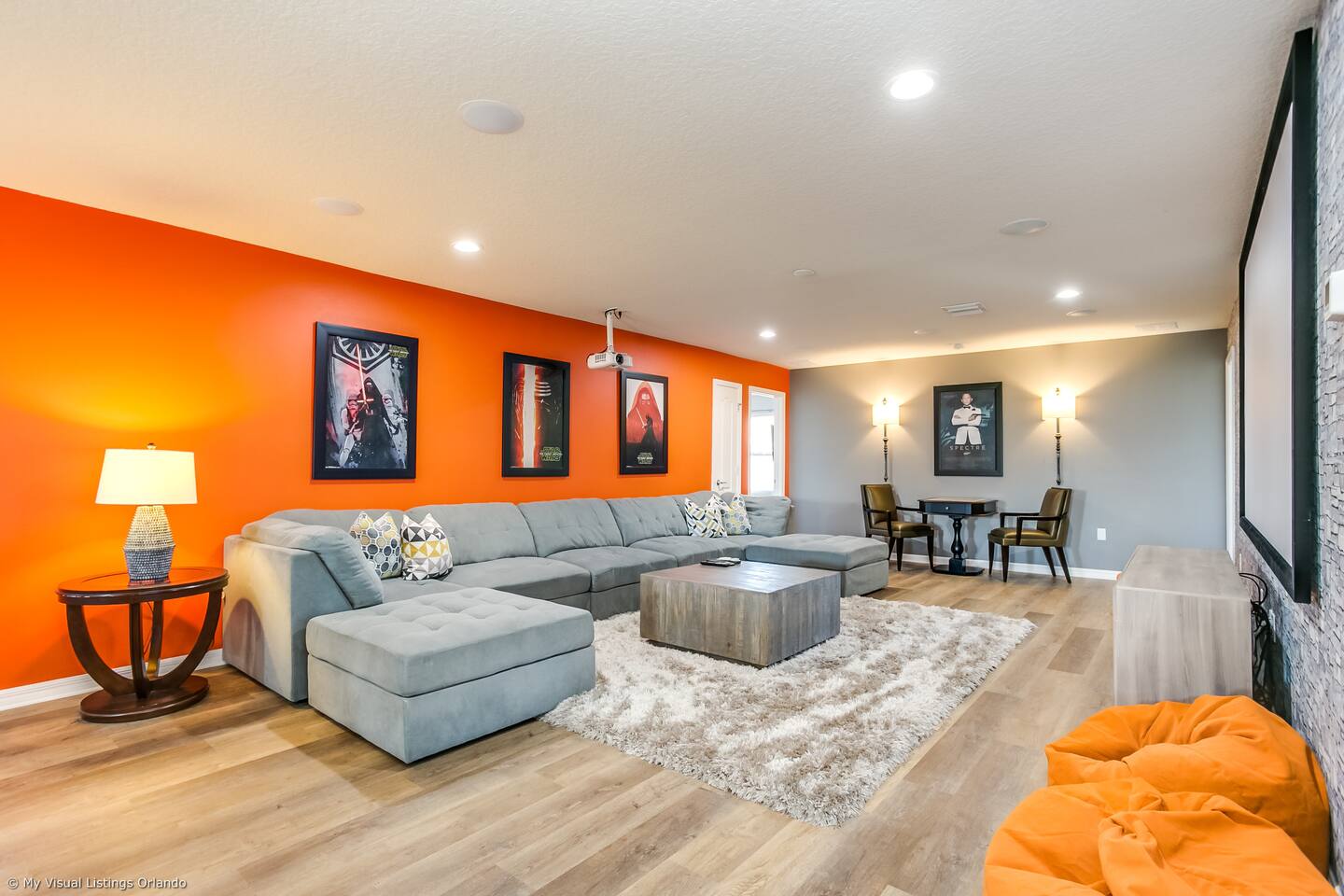 The Southern Wonder of the World | Must See - One of the Best Homes in Windsor at Westside Property Summary Professionally designed and furnished by one of the country’s foremost and world renowned design experts the appropriately named, Southern Wonder of the World, is one of Florida’s most unique vacation properties. The property has all that a family or large group needs for a completely immersive entertainment experience. With a private swimming pool, luxurious bedroom furnishings, themed kids rooms, State of the Art game room, and Movie Theater room, you can spend a whole day relaxing or having fun. With 4,000+ sq. ft. to share with your family or group coupled with the pool deck, this home holds up to 16+ guests. The home is also hypoallergenic with no carpeting in the home and a ceiling fan in each bedroom to aide fresh air flow throughout the home. The home is a short walk from the state-of the art clubhouse at Windsor at Westside. What a great place for families to share! The game room is air-conditioned and fully stocked with action! Feeling competitive? Up for some games? Here you can find foosball, Marvel Air Hockey, Ping-pong, an XBOX station with a large screen TV, and an additional large flat screen TV for watching your favorite movies or sports. Be amazed and immerse yourself in the “Marvel” room and be sure to take a picture next to your favorite Marvel character! The pool area is where you can enjoy the sun, the fresh air, and the refreshing pool water. There are sun loungers and a spillover spa for complete relaxation. For added safety, the pool deck comes equipped with a safety fence. The kitchen is fully equipped with all of your needs from stainless steel appliances, to a toaster and coffee maker. The home has a spacious open floor plan and sits on one of the best lots in Windsor at Westside. The dining area has seating for 16+ where bellies are made full and memories are sure to be created. The breakfast bar also has 4 amazing bar stools to accommodate more family time together. The living room has a huge modern 84" fan. By day watch your favorite shows on the wall mounted 75" LED TV, then in the evenings enjoy movies and sports on the 120" projector screen complete with theater-like seating, complete state of the art surround sound system, and subwoofer. Upstairs there is a huge Princess immersive experience themed kids bedroom complete with dynamic fiber optic lighting, hand painted effects, LED lighting, Princess themed dynamic effects, and other Princess amazement. There is also an amazing custom-built Monsters themed bedroom complete with custom LED lighting, kids toys, special themed furniture, custom painted walls, murals, and custom shelving. Features: • 8 Bedrooms and 6 Full Bathrooms • Covered Lanai with Heated Pool/Spa (no rear neighbors for privacy) • Outside Dining Table and Dining Bar • Well equipped Kitchen with Counter Stools and Extra-Large Dining Table • Large Gathering Room with 75” 4k Smart TV/Multi-Region Blu Ray • Second Floor Games Room with Movie Theater • Xbox 360 • Surround Sound System • Poker and numerous Board Games and DVDs to cater for all ages • Additional Games Room with Table Tennis, Foosball, and Air Hockey • Smart TVs with Netflix in every Bedroom • Complimentary Cable TV, High-Speed WIFI and free calls to Canada and U.S. • A/C and ceiling fans in every room to maximize comfort • Baby equipment provided at no charge (pack and play, highchair) • Full Washer/Dryer, Linen and Towels provided • Hair Dryers, Ironing Board & Iron Sleeps 16: • Suite 1- King Bed • Suite 2- King Bed • Suite 3- King Bed • Suite 4- Queen Bed • Bed 5- Two Twin Beds • Bed 6- Two Twin Beds • Bed 7- Queen Bed • Bed 8- Queen Bed