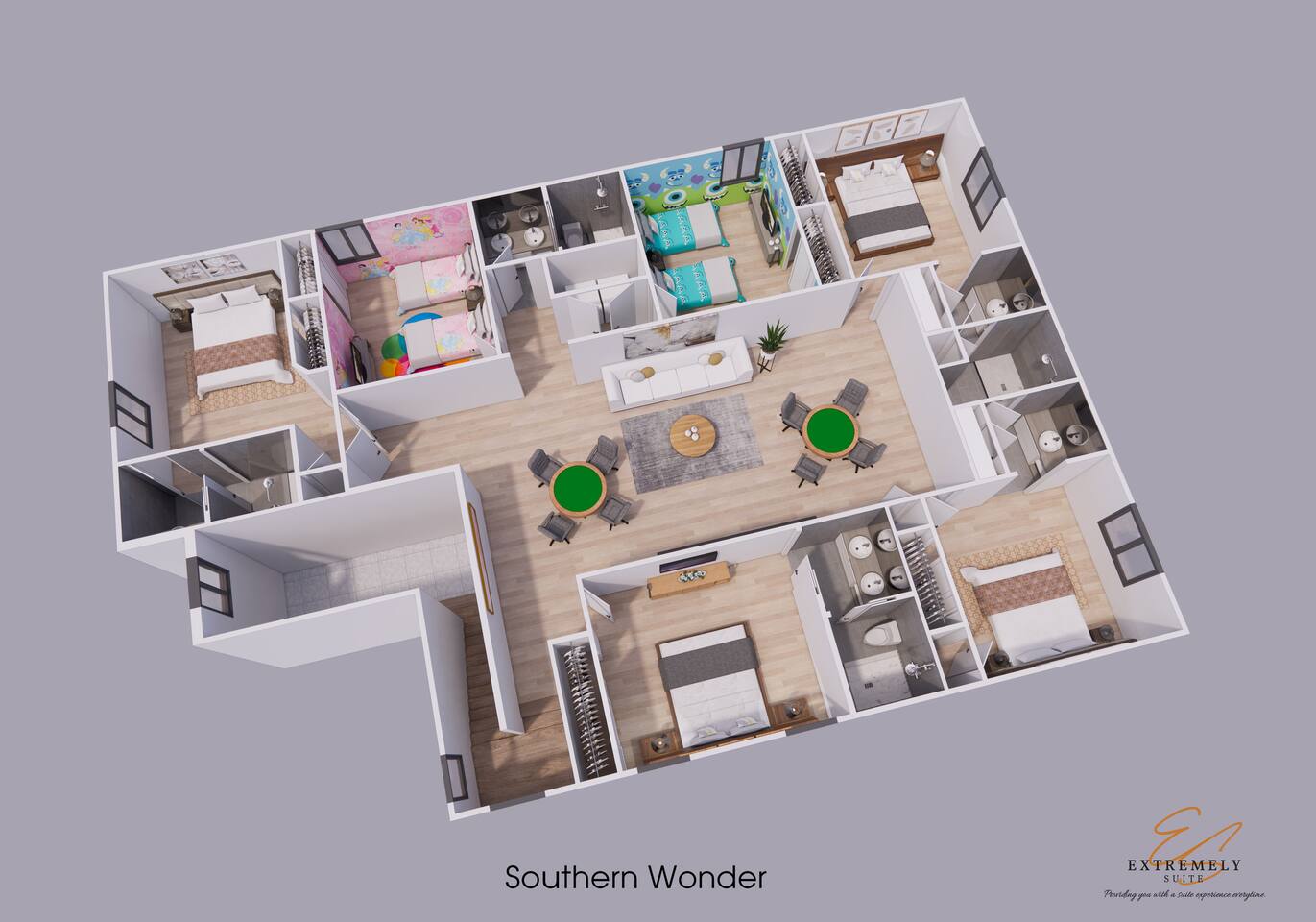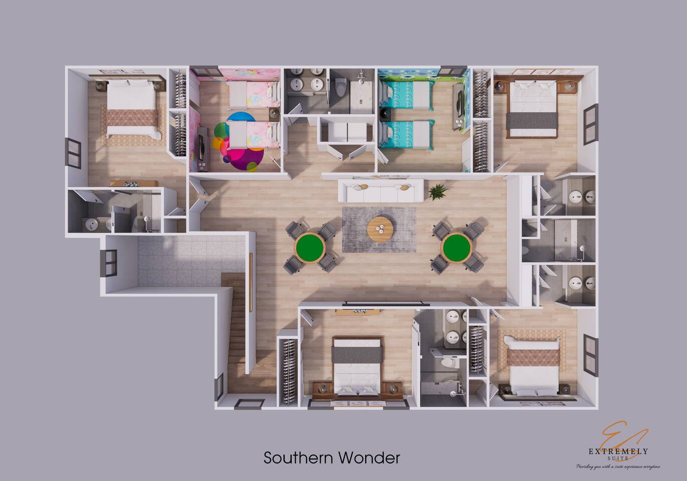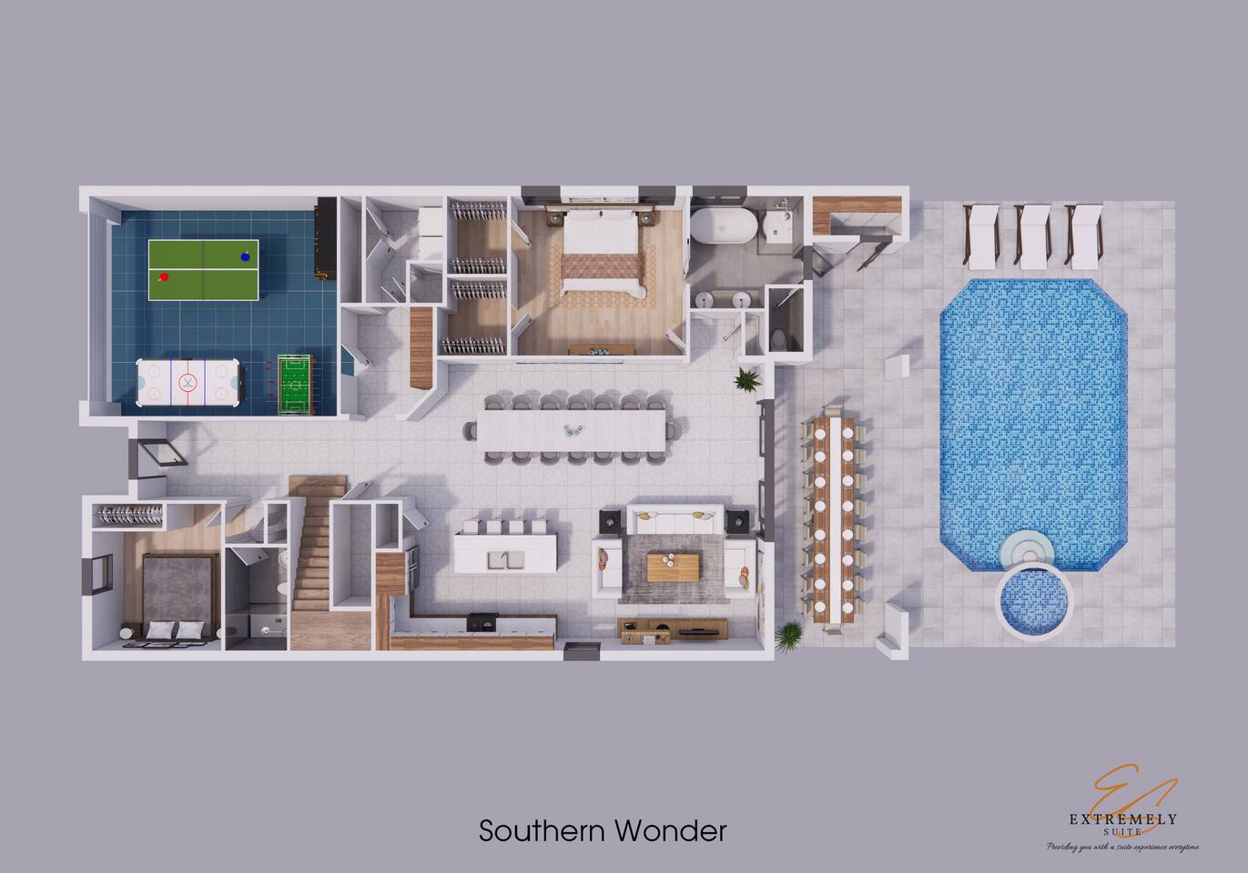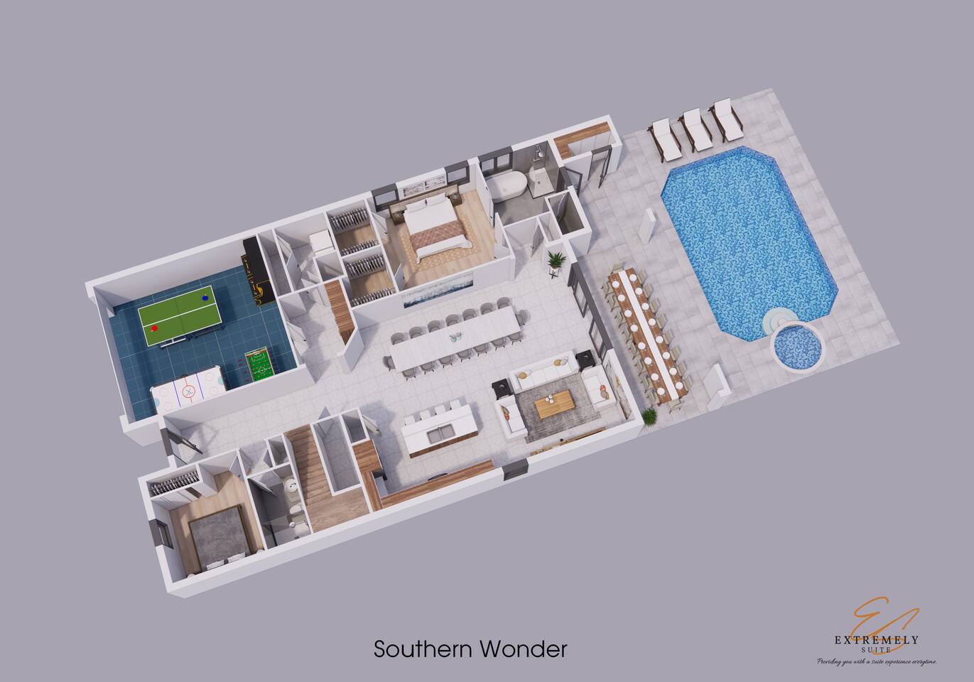 Professionally designed and furnished by one of the country’s foremost and world renowned design experts the appropriately named, Southern Wonder of the World, is one of Florida’s most unique vacation properties. The property has all that a family or large group needs for a completely immersive entertainment experience. With a private swimming pool, luxurious bedroom furnishings, themed kids rooms, State of the Art game room, and Movie room, you can spend a whole day relaxing or having fun.